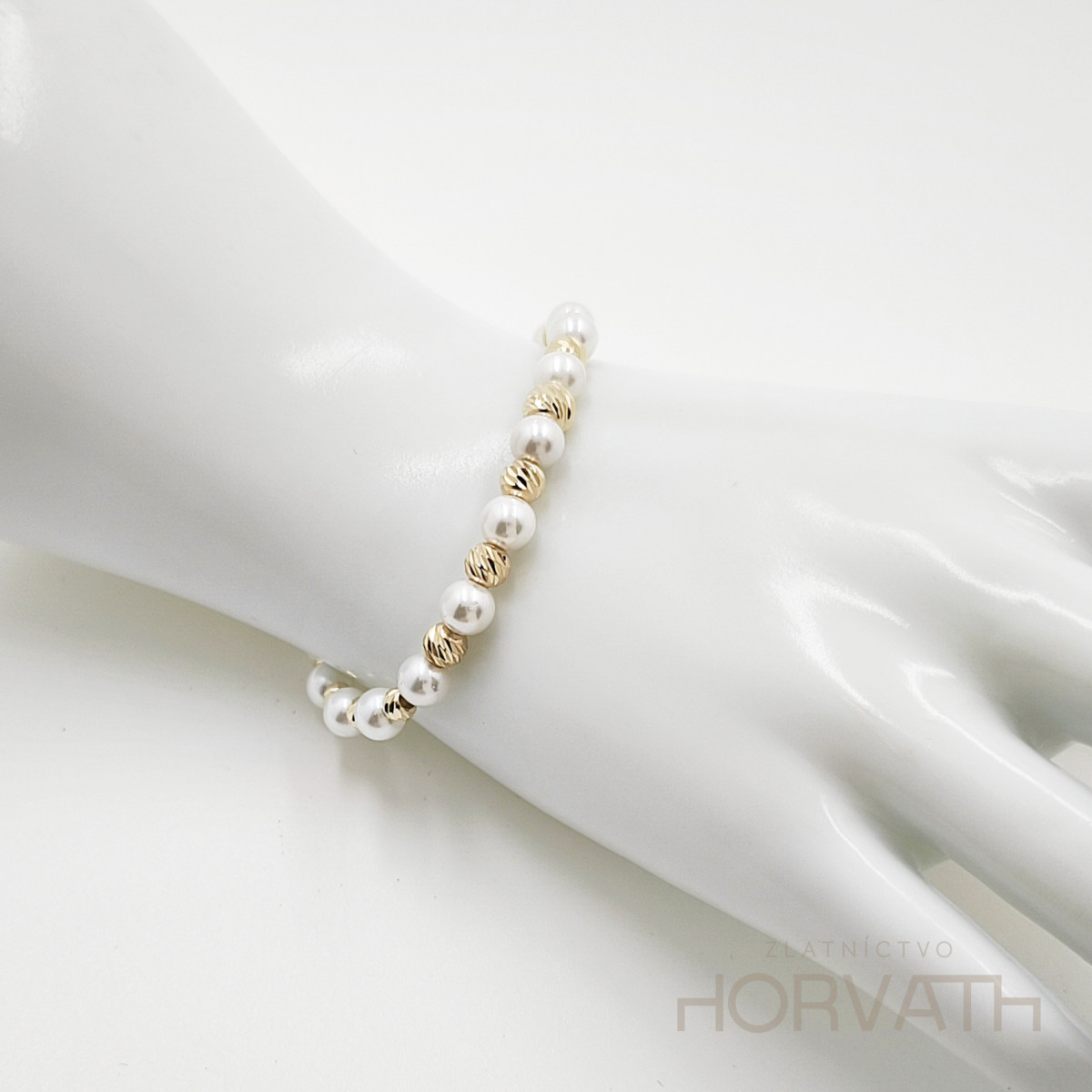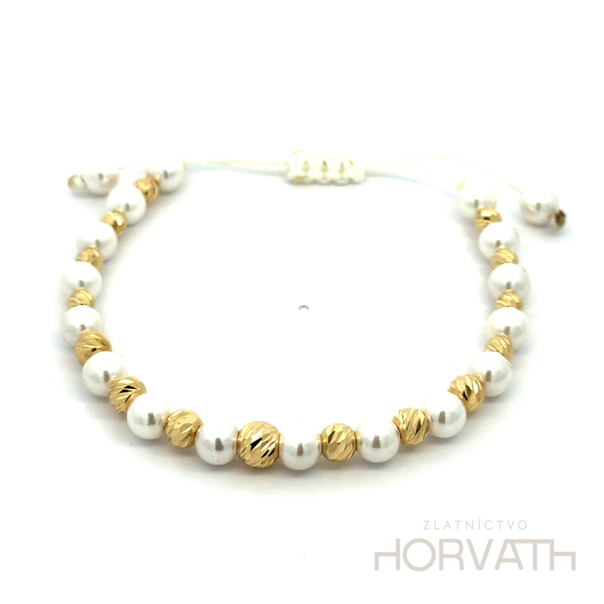 Zlatý náramok kombinovaný s riečnymi perlami ,zlaté guličky sú vyrobené zo 14 karátového zlata 585/1000. Zapínanie je posuvné, obvod je teda nastaviteľný.