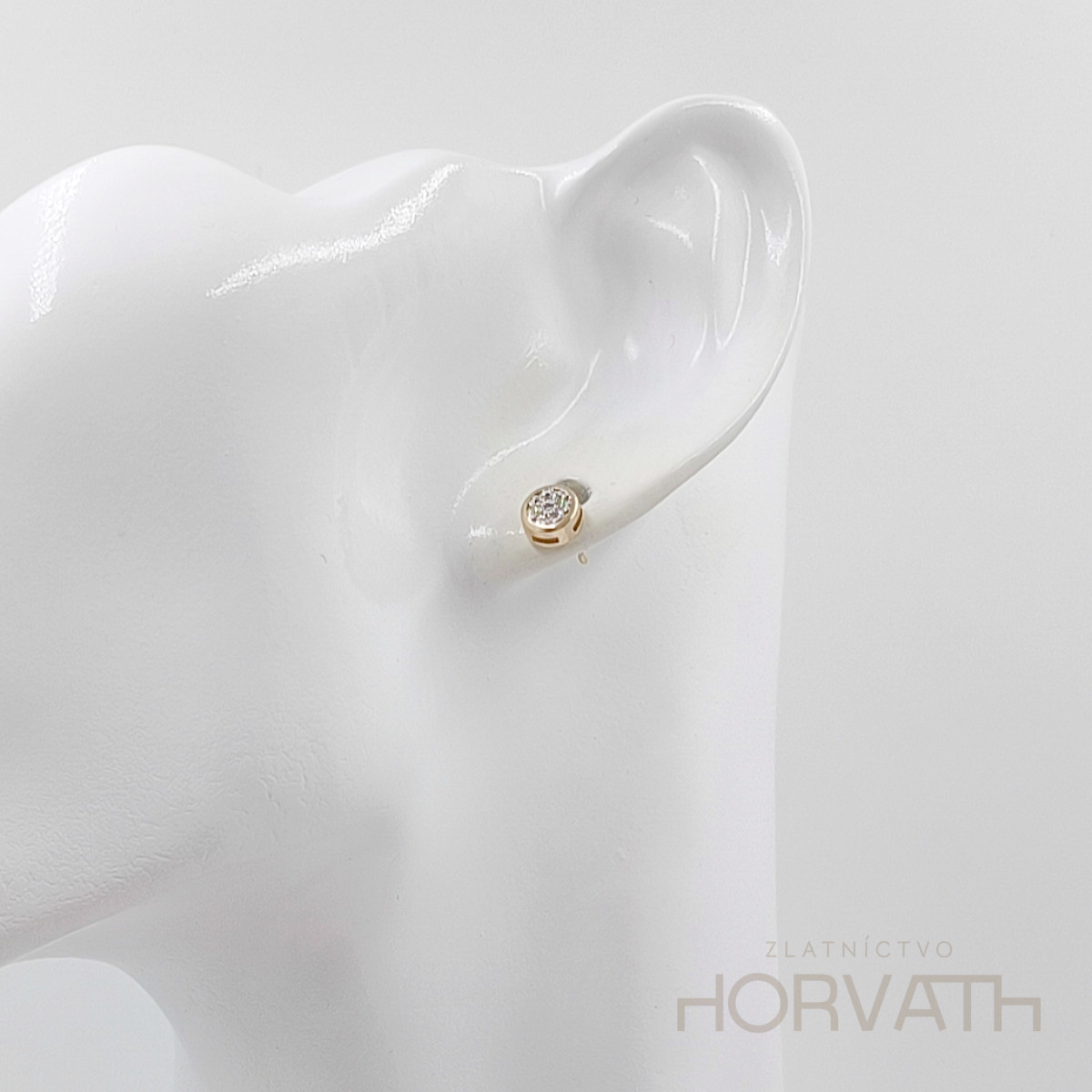 Zlaté náušnice sú vyrobené zo 14 karátového zlata 585/000. Náušnice zdobia brilianty s karátovosťou 2x 0,08 ct. Čistota briliantov je SI2 farba H. Rozmer náušníc je 5 mm.