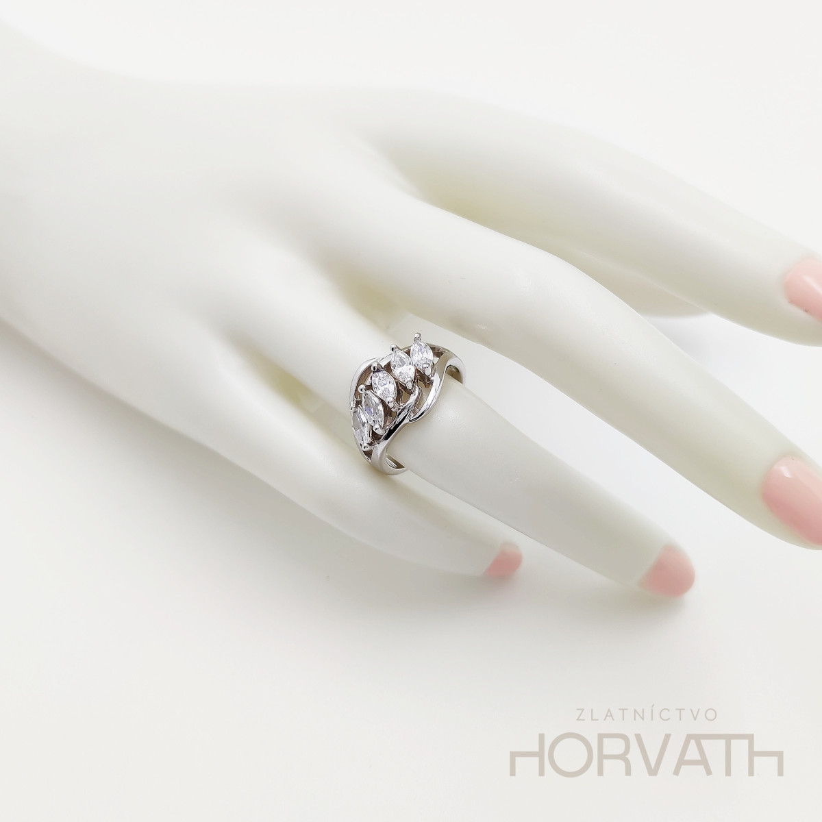 Strieborný dámsky prsteň vyrobený zo striebra 925/000.Typ povrchovej úpravy u tohto šperku je ródium.Ródium je chemický prvok obľúbený u šperkárov.Je to kov strieborno-bielej farby a patrí medzi najdrahšie kovy.Táto povrchová úprava slúži na ochranu striebra ,predlžuje striebru životnosť,striebro tak neoxiduje,nežltne a stále sa krásne leskne.Šírka vrchnej plochy prsteňa je 1cm.