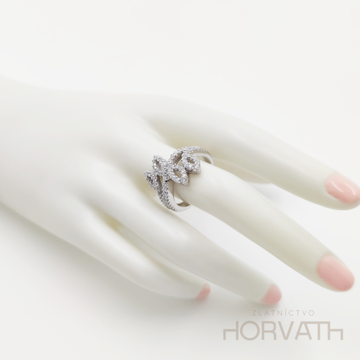 Strieborný dámsky krásny ligotavý prsteň vyrobený zo striebra 925/000.Typ povrchovej úpravy u tohto šperku je ródium.Ródium je chemický prvok obľúbený u šperkárov.Je to kov strieborno-bielej farby a patrí medzi najdrahšie kovy.Táto povrchová úprava slúži na ochranu striebra ,predlžuje striebru životnosť,striebro tak neoxiduje,nežltne a stále sa krásne leskne.