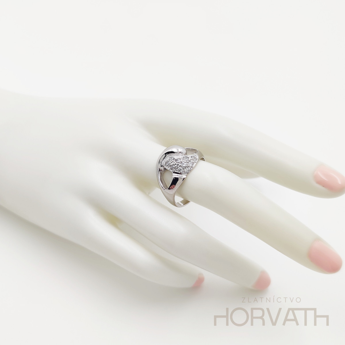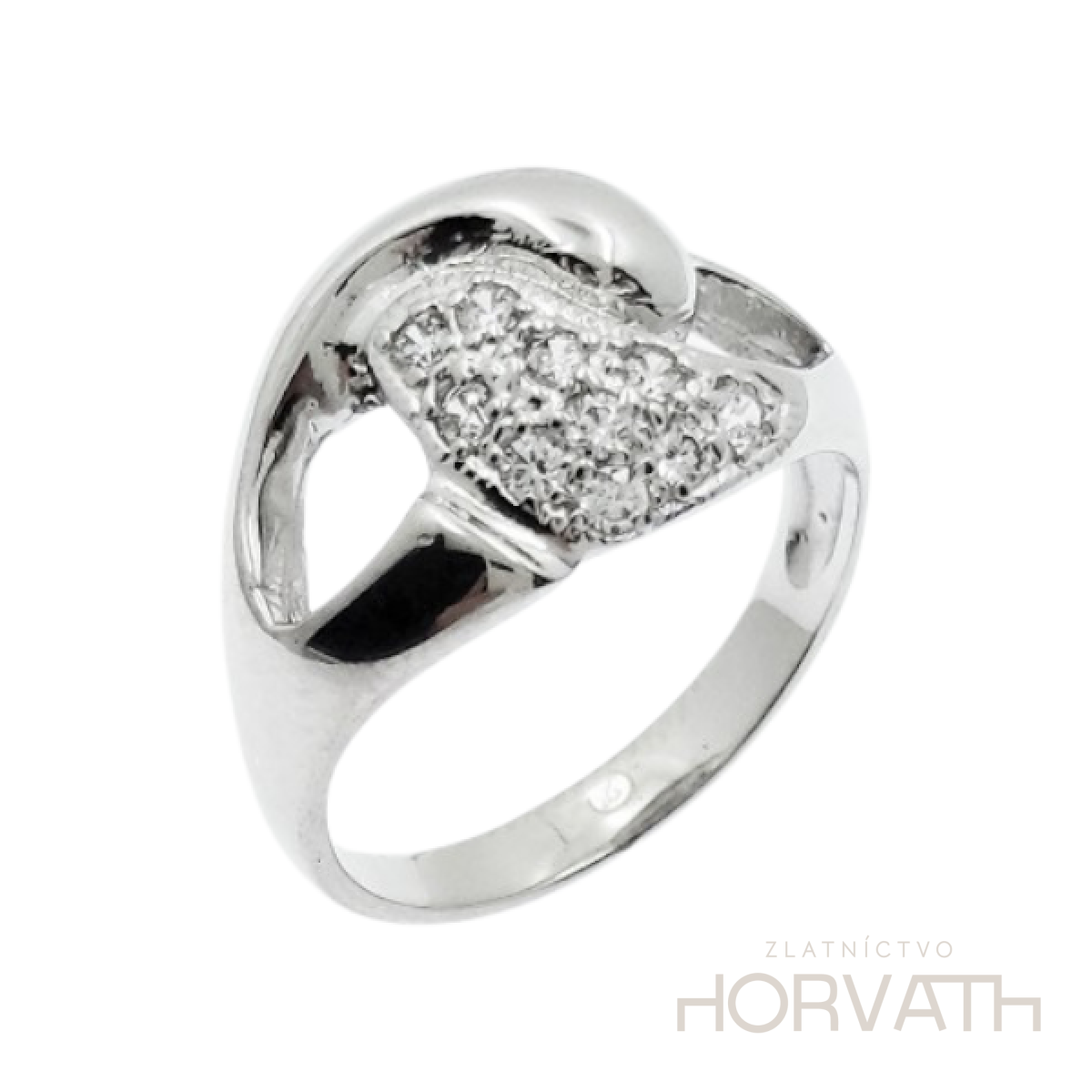 Strieborný dámsky prsteň vyrobený zo striebra 925/000.Typ povrchovej úpravy u tohto šperku je ródium.Ródium je chemický prvok obľúbený u šperkárov.Je to kov strieborno-bielej farby a patrí medzi najdrahšie kovy.Táto povrchová úprava slúži na ochranu striebra ,predlžuje striebru životnosť,striebro tak neoxiduje,nežltne a stále sa krásne leskne.Šírka vrchnej plochy prsteňa je 1,2cm.