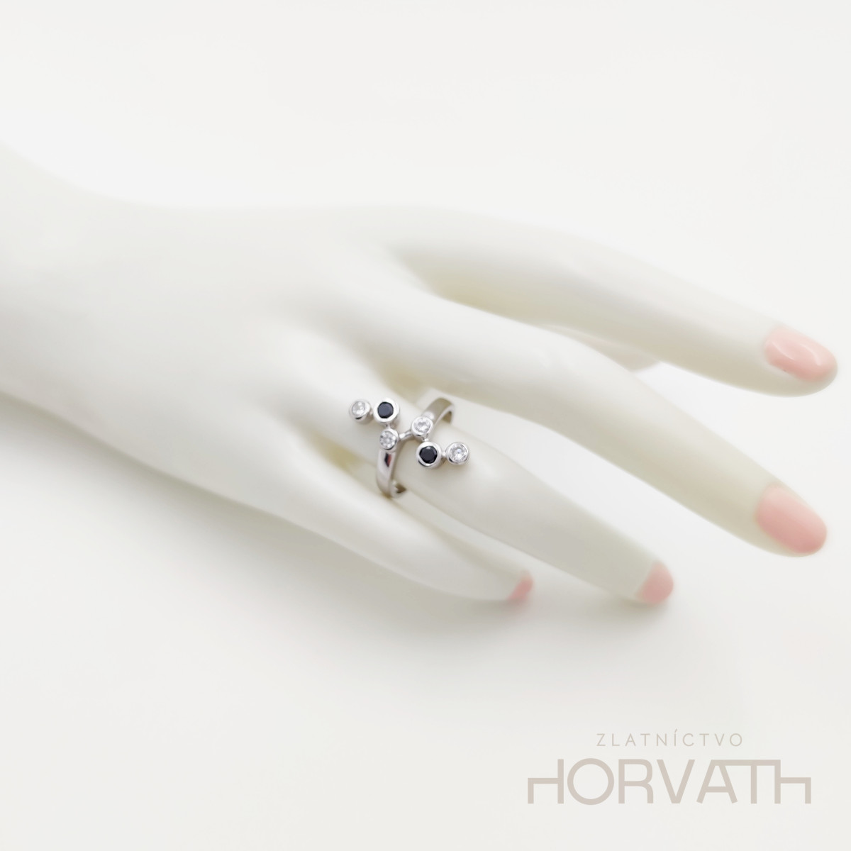 Strieborný dámsky prsteň vyrobený zo striebra 925/000.Typ povrchovej úpravy u tohto šperku je ródium.Ródium je chemický prvok obľúbený u šperkárov.Je to kov strieborno-bielej farby a patrí medzi najdrahšie kovy.Táto povrchová úprava slúži na ochranu striebra ,predlžuje striebru životnosť,striebro tak neoxiduje,nežltne a stále sa krásne leskne.Dĺžka prsteňa je 2cm.