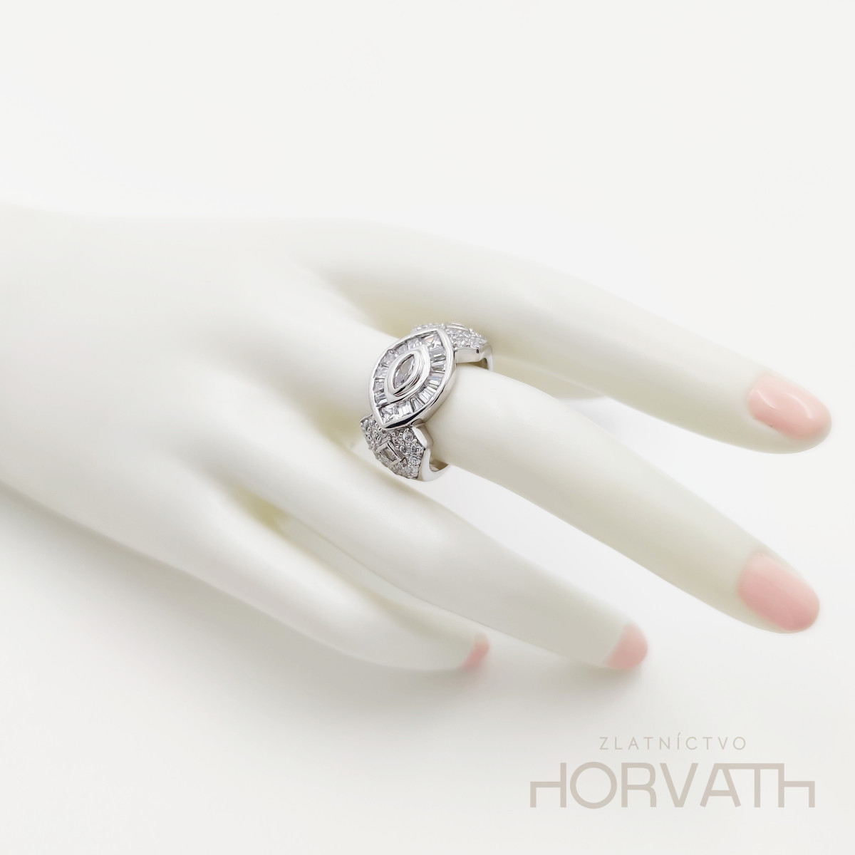 Strieborný dámsky prsteň vyrobený zo striebra 925/000.Typ povrchovej úpravy u tohto šperku je ródium.Ródium je chemický prvok obľúbený u šperkárov.Je to kov strieborno-bielej farby a patrí medzi najdrahšie kovy.Táto povrchová úprava slúži na ochranu striebra ,predlžuje striebru životnosť,striebro tak neoxiduje,nežltne a stále sa krásne leskne.Prsteň je zdobený jemnými zirkónmi.Šírka prsteňa je 1,2cm.
