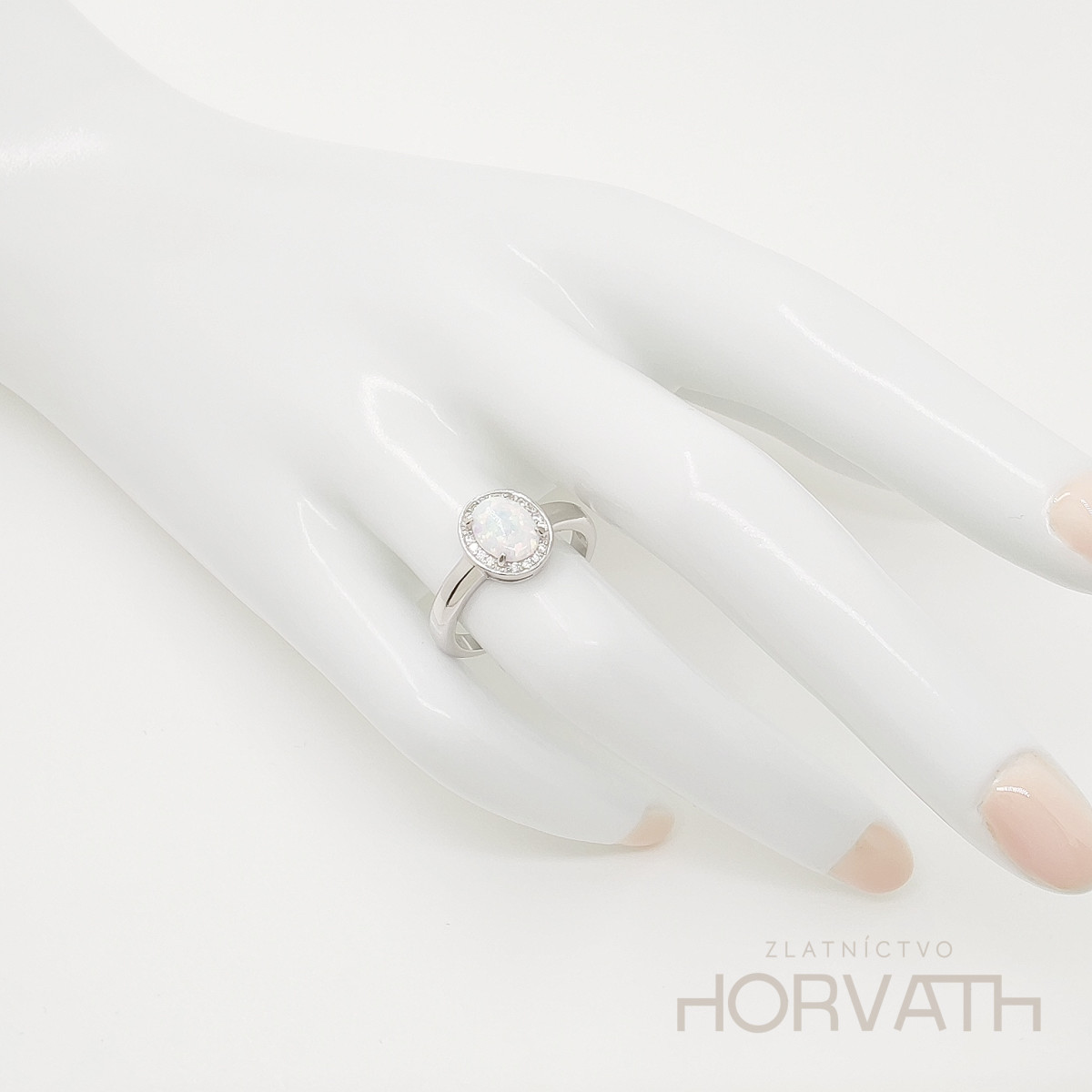 Strieborný dámsky prsteň zdobený opálom a zirkónmi je vyrobený zo striebra 925/000.Typ povrchovej úpravy u tohto šperku je ródium.Ródium je chemický prvok obľúbený u šperkárov.Je to kov strieborno-bielej farby a patrí medzi najdrahšie kovy.Táto povrchová úprava slúži na ochranu striebra ,predlžuje striebru životnosť,striebro tak neoxiduje,nežltne a stále sa krásne leskne