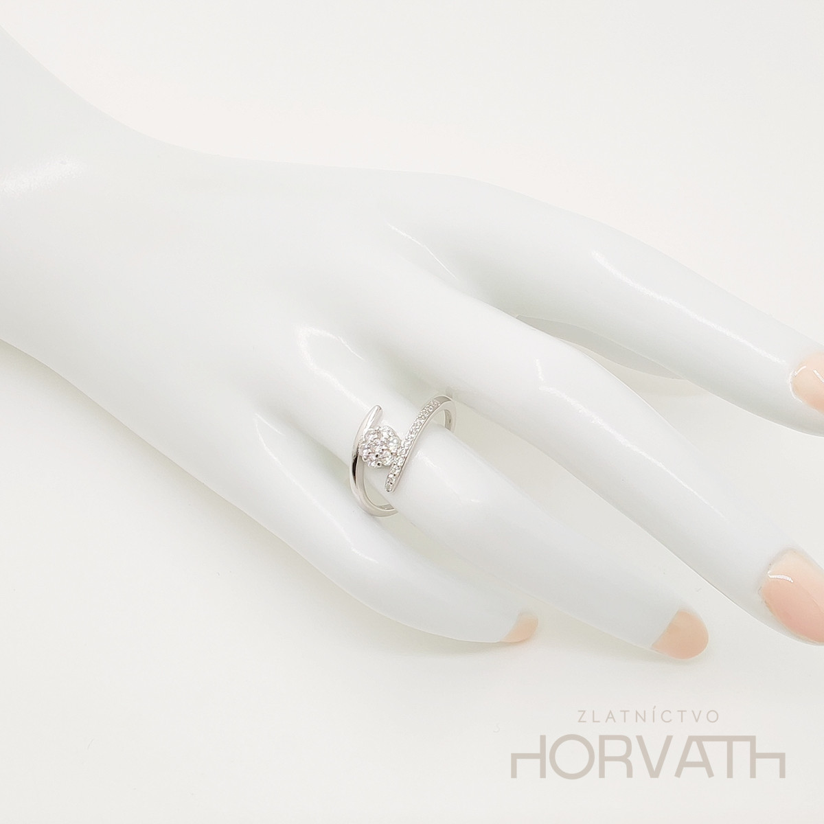 Strieborný dámsky prsteň vyrobený zo striebra 925/000.Typ povrchovej úpravy u tohto šperku je ródium.Ródium je chemický prvok obľúbený u šperkárov.Je to kov strieborno-bielej farby a patrí medzi najdrahšie kovy.Táto povrchová úprava slúži na ochranu striebra ,predlžuje striebru životnosť,striebro tak neoxiduje,nežltne a stále sa krásne leskne.