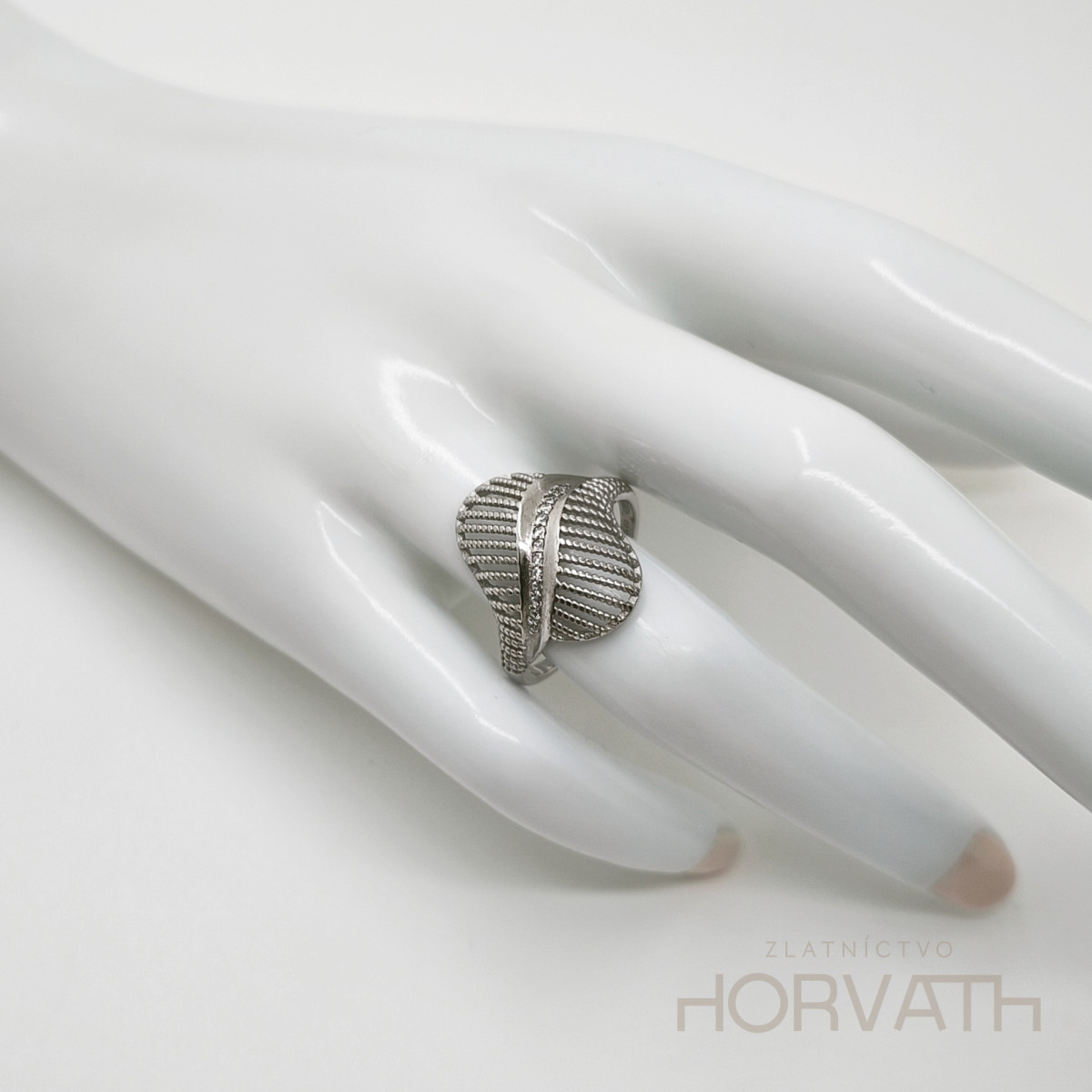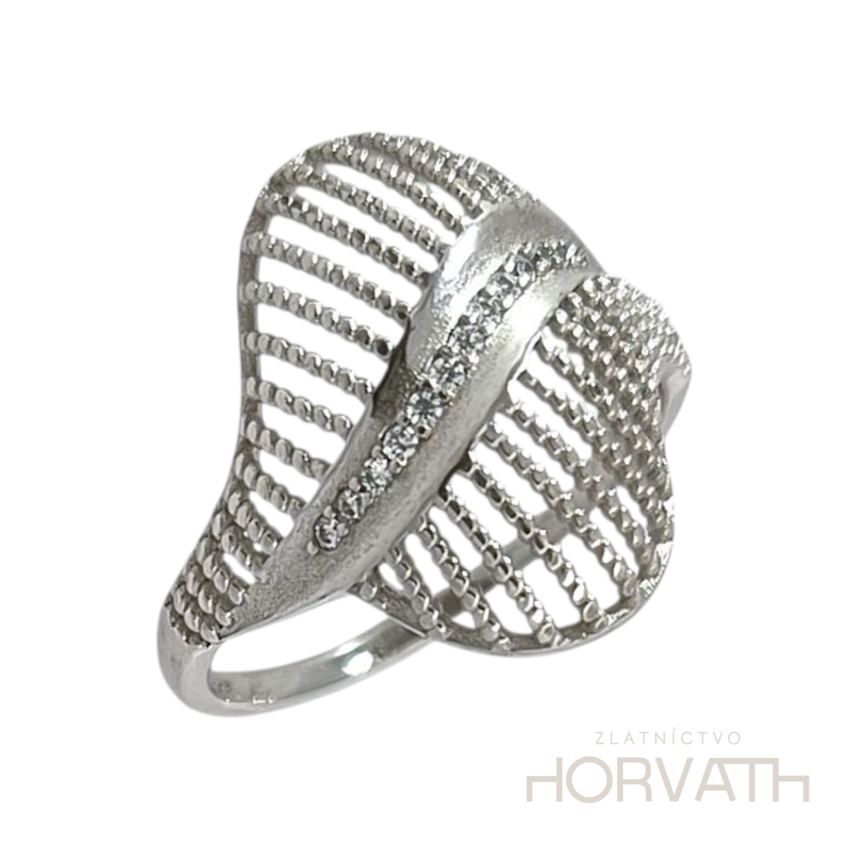 Strieborný dámsky prsteň je vyrobený zo striebra 925/000.Typ povrchovej úpravy u tohto šperku je ródium.Ródium je chemický prvok obľúbený u šperkárov.Je to kov strieborno-bielej farby a patrí medzi najdrahšie kovy.Táto povrchová úprava slúži na ochranu striebra ,predlžuje striebru životnosť,striebro tak neoxiduje,nežltne a stále sa krásne leskne.