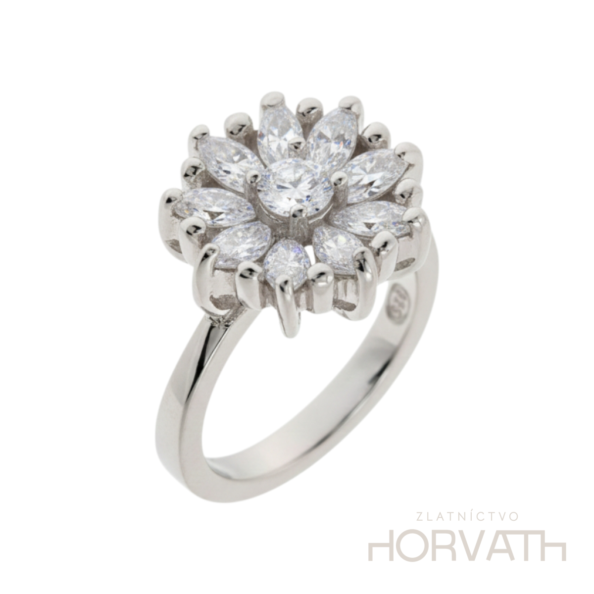 Strieborný dámsky prsteň vyrobený zo striebra 925/000.Typ povrchovej úpravy u tohto šperku je ródium.Ródium je chemický prvok obľúbený u šperkárov.Je to kov strieborno-bielej farby a patrí medzi najdrahšie kovy.Táto povrchová úprava slúži na ochranu striebra ,predlžuje striebru životnosť,striebro tak neoxiduje,nežltne a stále sa krásne leskne.