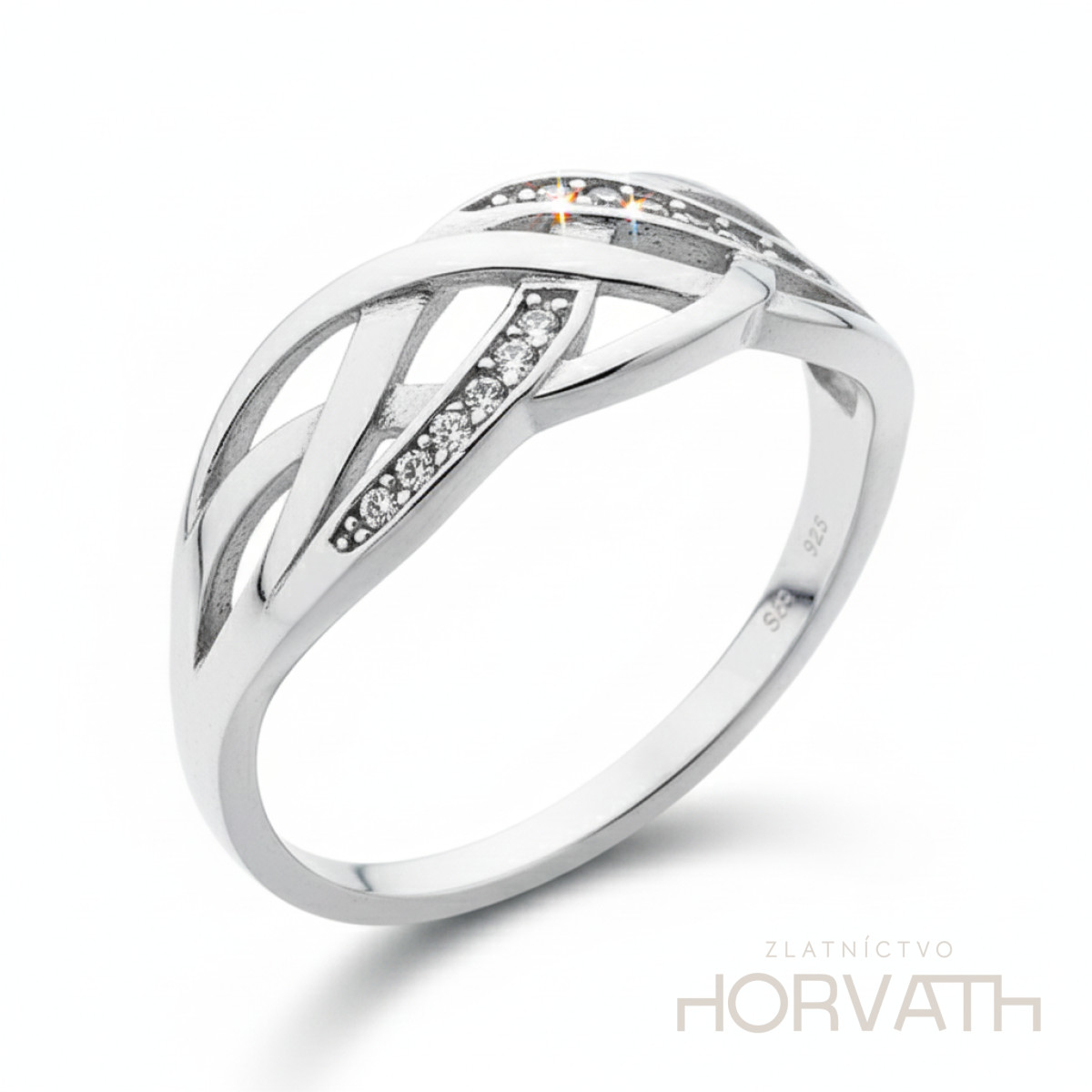 Strieborný dámsky prsteň vyrobený zo striebra 925/000.Typ povrchovej úpravy u tohto šperku je ródium.Ródium je chemický prvok obľúbený u šperkárov.Je to kov strieborno-bielej farby a patrí medzi najdrahšie kovy.Táto povrchová úprava slúži na ochranu striebra ,predlžuje striebru životnosť,striebro tak neoxiduje,nežltne a stále sa krásne leskne.