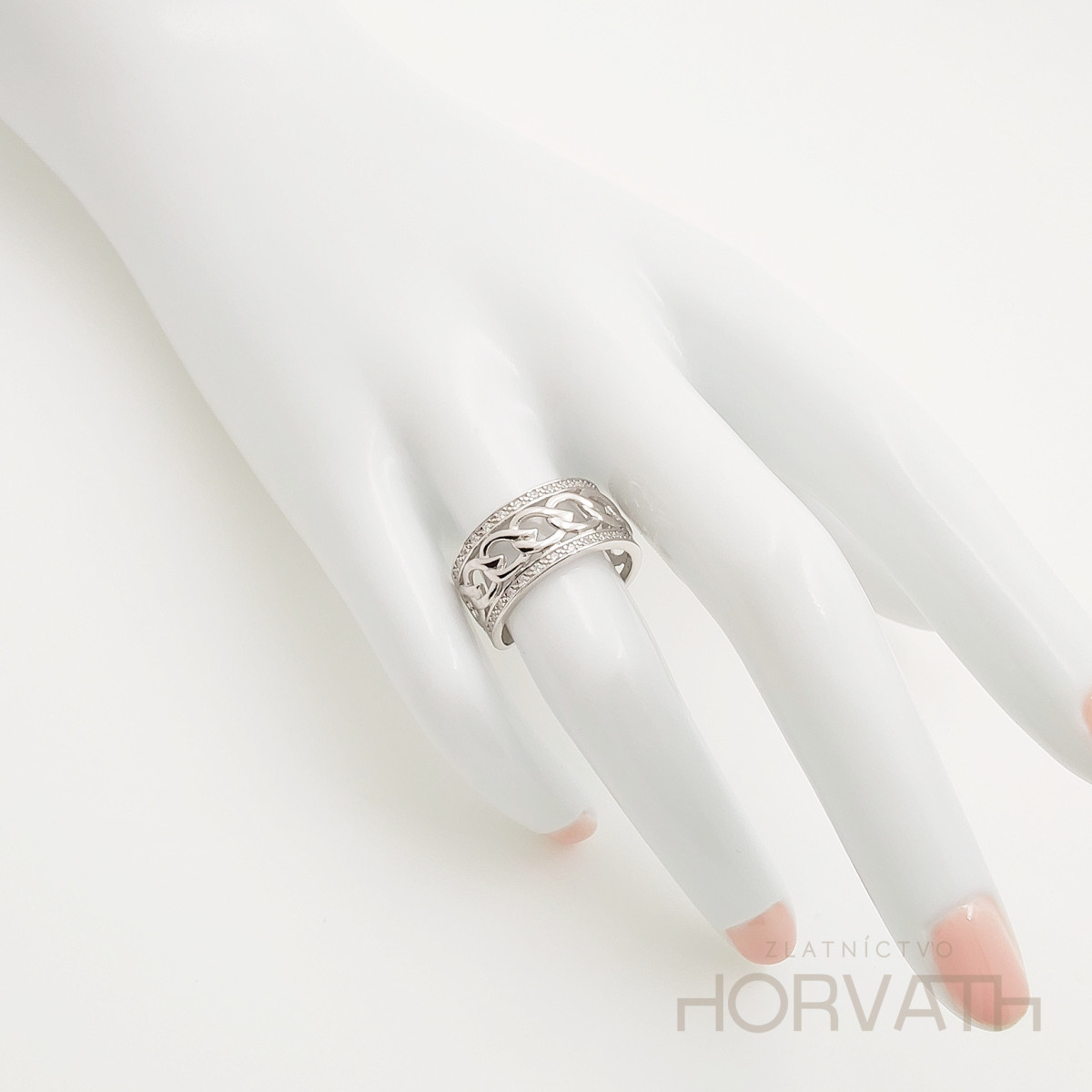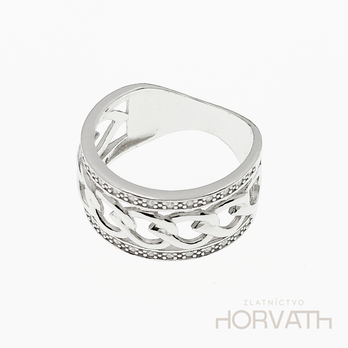 Strieborný dámsky prsteň vyrobený zo striebra 925/000.Typ povrchovej úpravy u tohto šperku je ródium.Ródium je chemický prvok obľúbený u šperkárov.Je to kov strieborno-bielej farby a patrí medzi najdrahšie kovy.Táto povrchová úprava slúži na ochranu striebra ,predlžuje striebru životnosť,striebro tak neoxiduje,nežltne a stále sa krásne leskne.