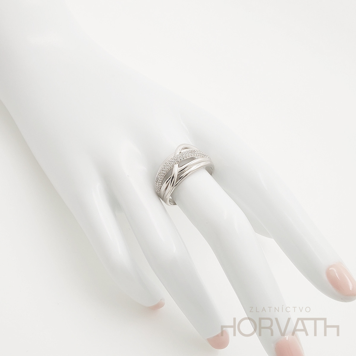 Strieborný dámsky prsteň vyrobený zo striebra 925/000.Typ povrchovej úpravy u tohto šperku je ródium.Ródium je chemický prvok obľúbený u šperkárov.Je to kov strieborno-bielej farby a patrí medzi najdrahšie kovy.Táto povrchová úprava slúži na ochranu striebra ,predlžuje striebru životnosť,striebro tak neoxiduje,nežltne a stále sa krásne leskne.
