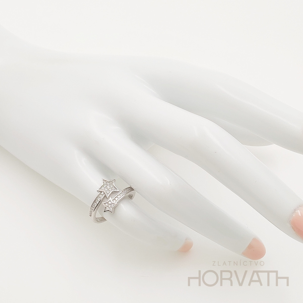Strieborný dámsky prsteň vyrobený zo striebra 925/000.Typ povrchovej úpravy u tohto šperku je ródium.Ródium je chemický prvok obľúbený u šperkárov.Je to kov strieborno-bielej farby a patrí medzi najdrahšie kovy.Táto povrchová úprava slúži na ochranu striebra ,predlžuje striebru životnosť,striebro tak neoxiduje,nežltne a stále sa krásne leskne.