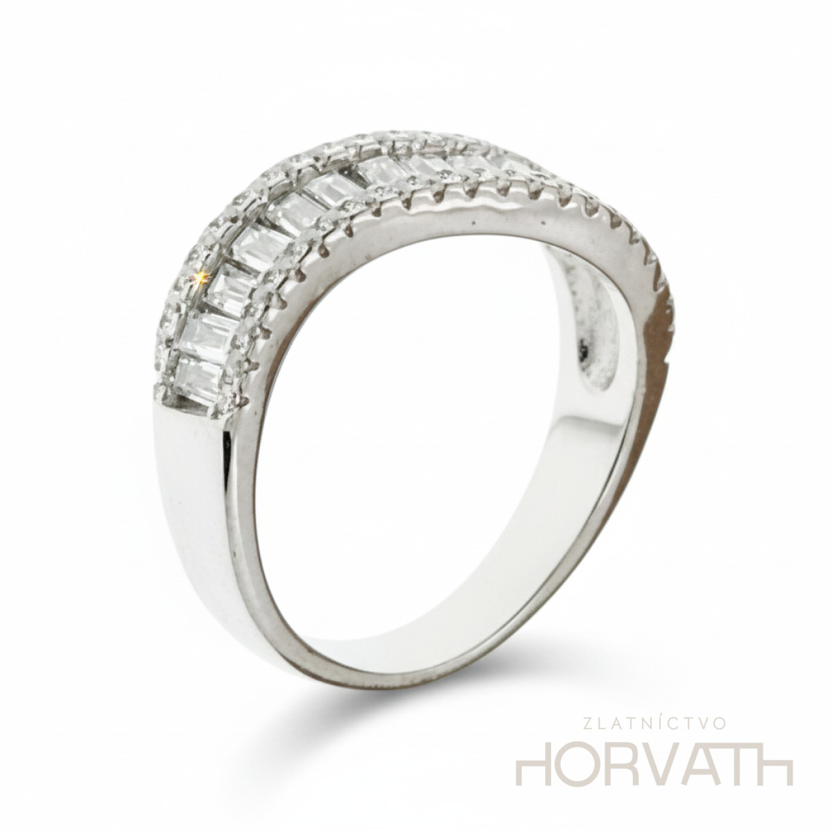 Strieborný dámsky prsteň vyrobený zo striebra 925/000.Typ povrchovej úpravy u tohto šperku je ródium.Ródium je chemický prvok obľúbený u šperkárov.Je to kov strieborno-bielej farby a patrí medzi najdrahšie kovy.Táto povrchová úprava slúži na ochranu striebra ,predlžuje striebru životnosť,striebro tak neoxiduje,nežltne a stále sa krásne leskne.