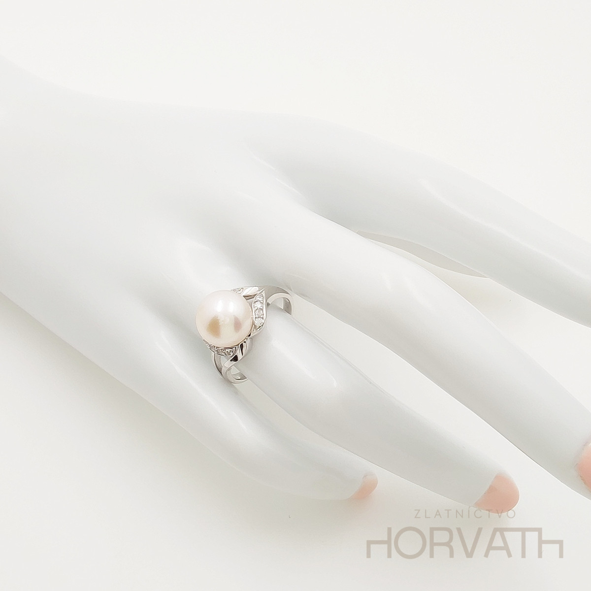 Strieborný dámsky prsteň zdobený riečnou perlou a zirkómi je vyrobený zo striebra 925/000.Typ povrchovej úpravy u tohto šperku je ródium.Ródium je chemický prvok obľúbený u šperkárov.Je to kov strieborno-bielej farby a patrí medzi najdrahšie kovy.Táto povrchová úprava slúži na ochranu striebra ,predlžuje striebru životnosť,striebro tak neoxiduje,nežltne a stále sa krásne leskne.
