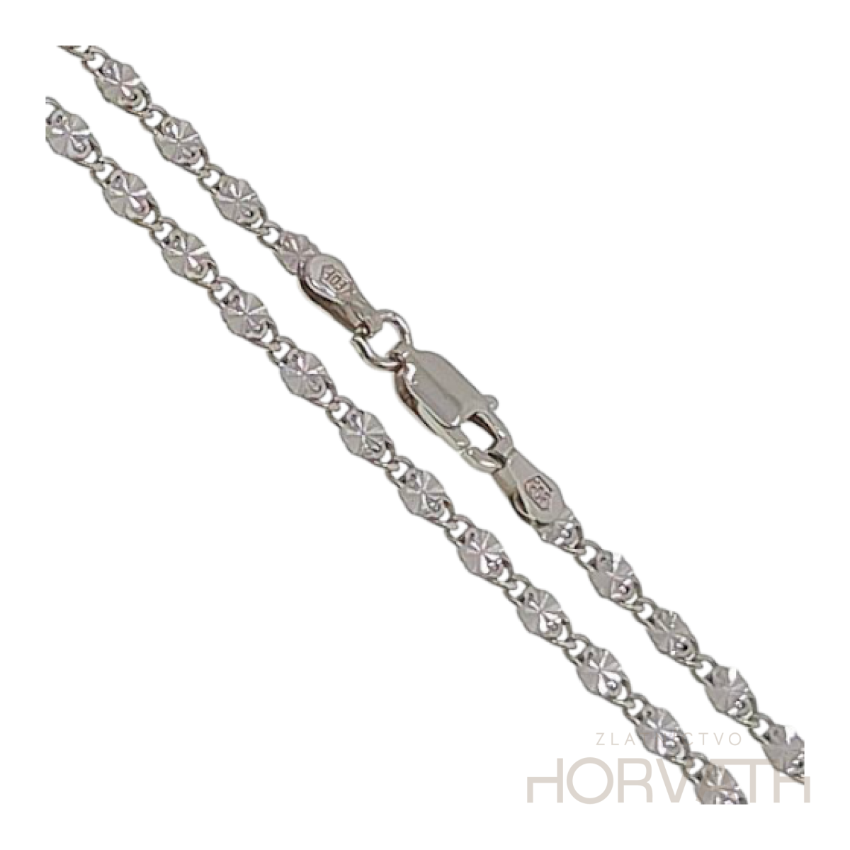 Strieborná retiazka je vyrobená zo striebra 925/1000. Typ povrchovej úpravy u tohto šperku je ródium. Ródium je chemický prvok obľúbený u šperkárov.Je to kov strieborno-bielej farby a patrí medzi najdrahšie kovy.Táto povrchová úprava slúži na ochranu striebra ,predlžuje striebru životnosť,striebro tak neoxiduje,nežltne a stále sa krásne leskne.