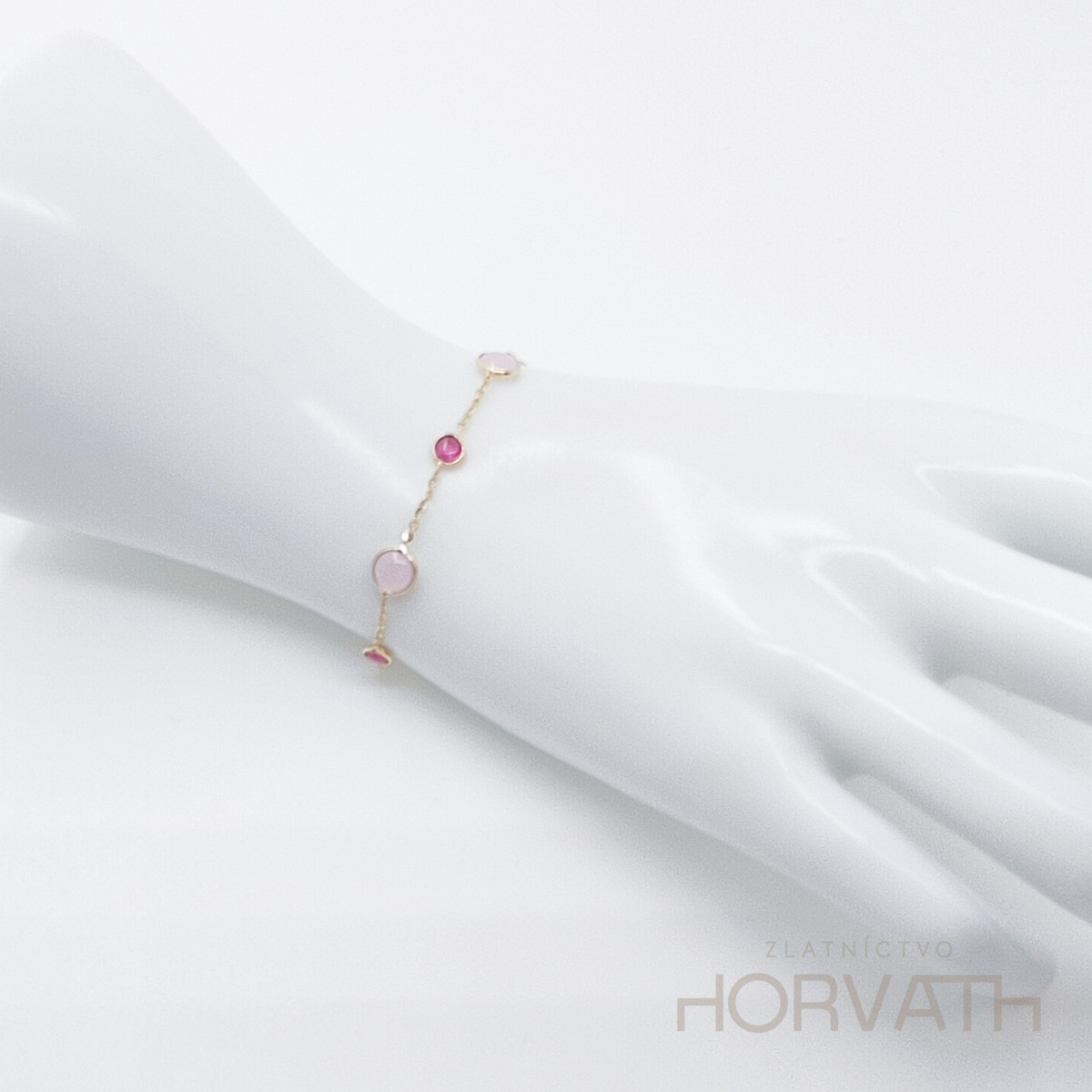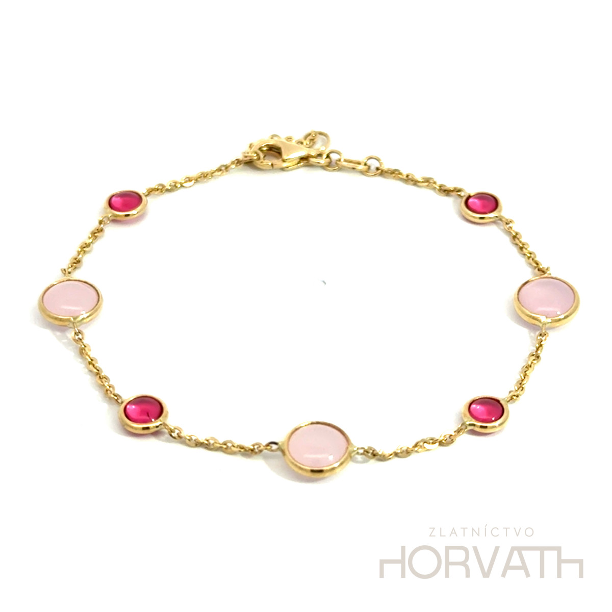 Zlatý náramok zdobený syntetickými kamienkami je vyrobený zo 14 karátového zlata 585/1000