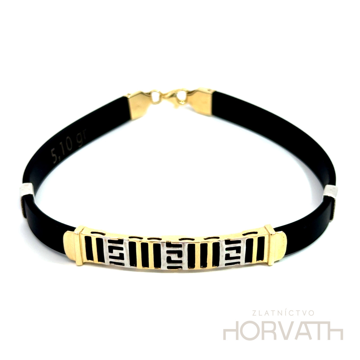 Štýlový pánsky kaučukový náramok je v strede dekorovaný zlatou ozdobou vyrobenou zo 14 karátového zlata 585/000.Dĺžka náramku je 22 cm.