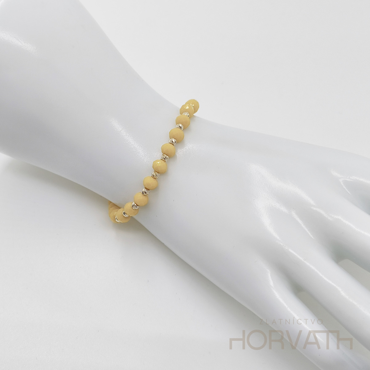 Zlatý náramok kombinovaný s minerálnymi kamienkami ,zlaté guličky sú zo 14 karátového zlata 585/1000.Zapínanie je posuvné, obvod je teda nastaviteľný.