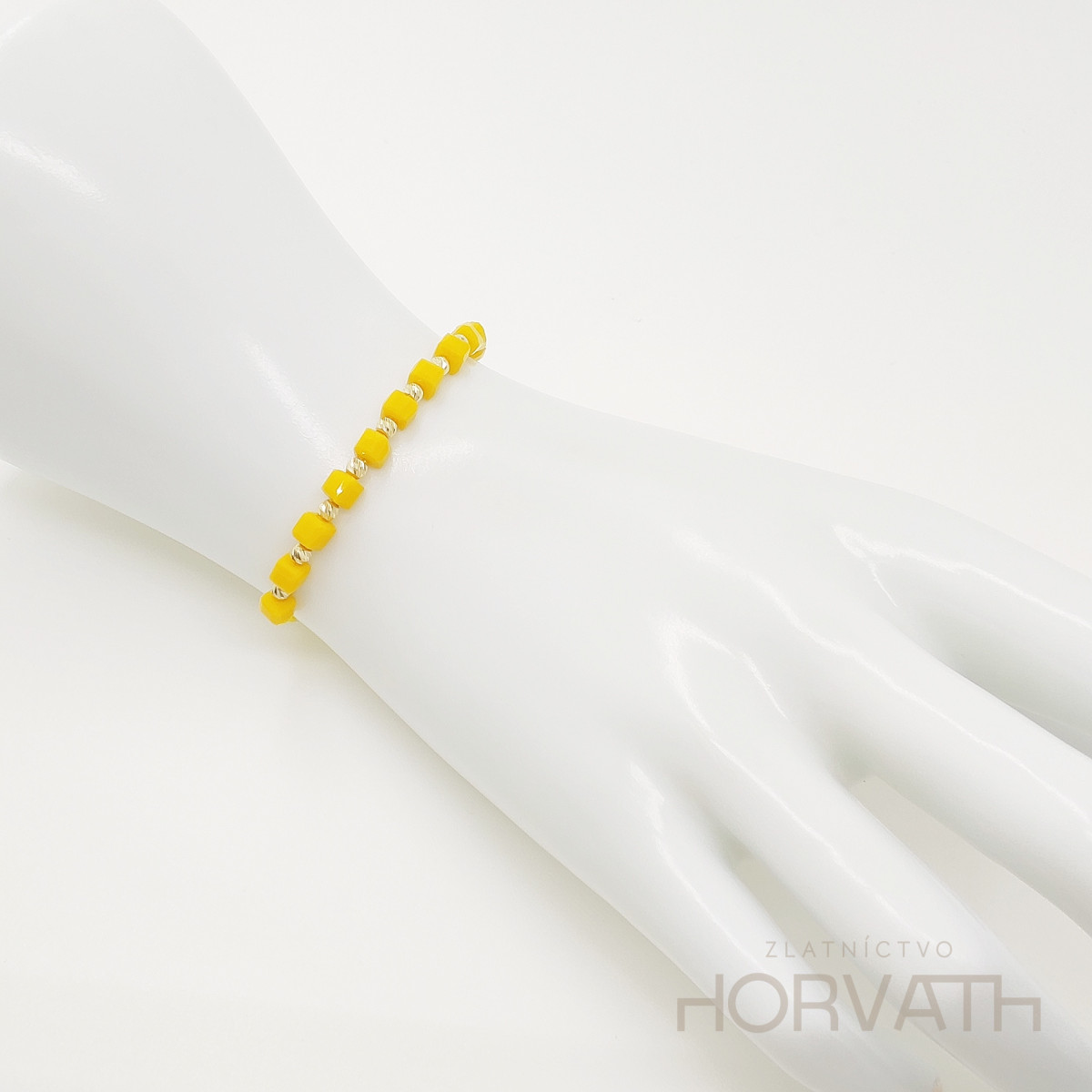 Zlatý náramok kombinovaný s minerálnymi kamienkami ,zlaté guličky sú zo 14 karátového zlata 585/1000.Zapínanie je posuvné, obvod je teda nastaviteľný.