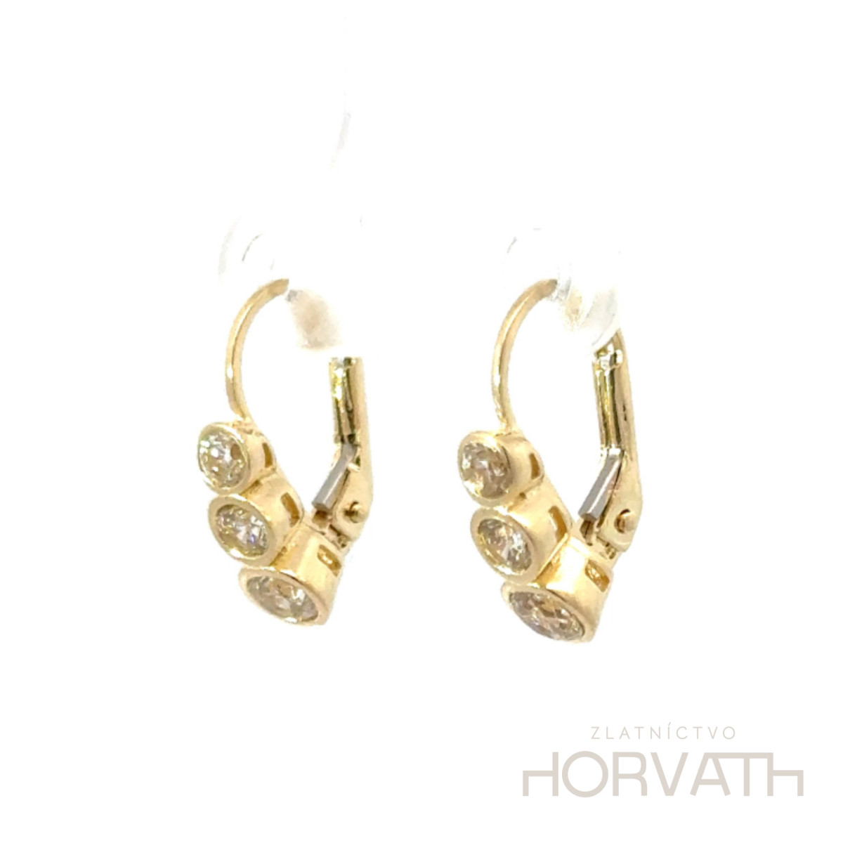 Zlaté náušnice zdobené zirkónmi sú na klasické zapínanie, vyrobené zo 14 karátového zlata 585/1000.