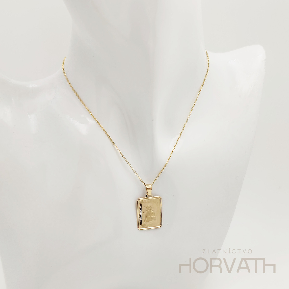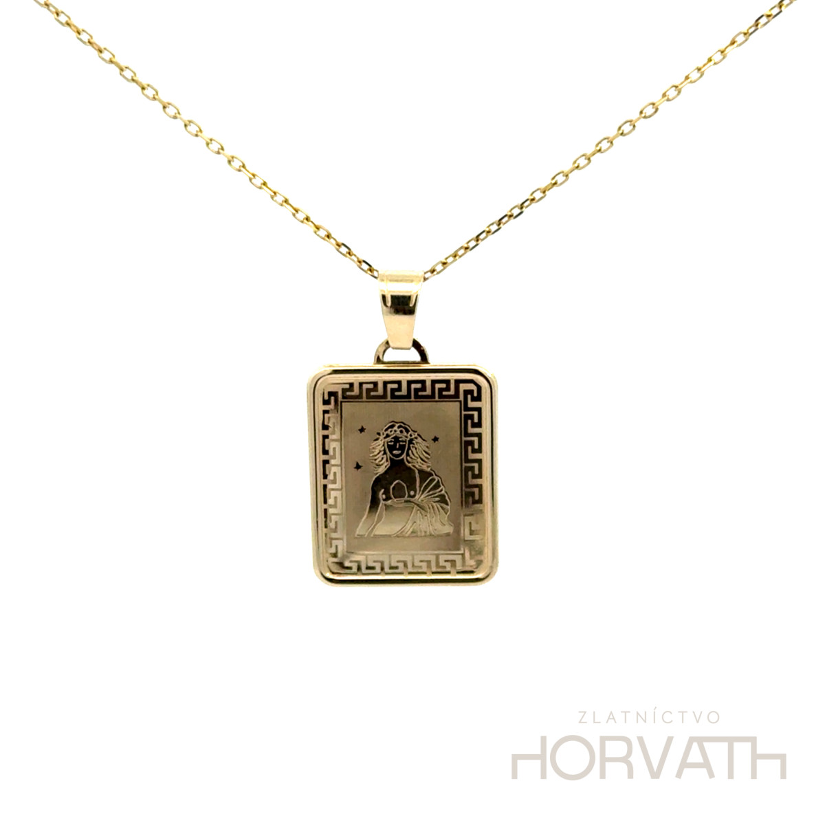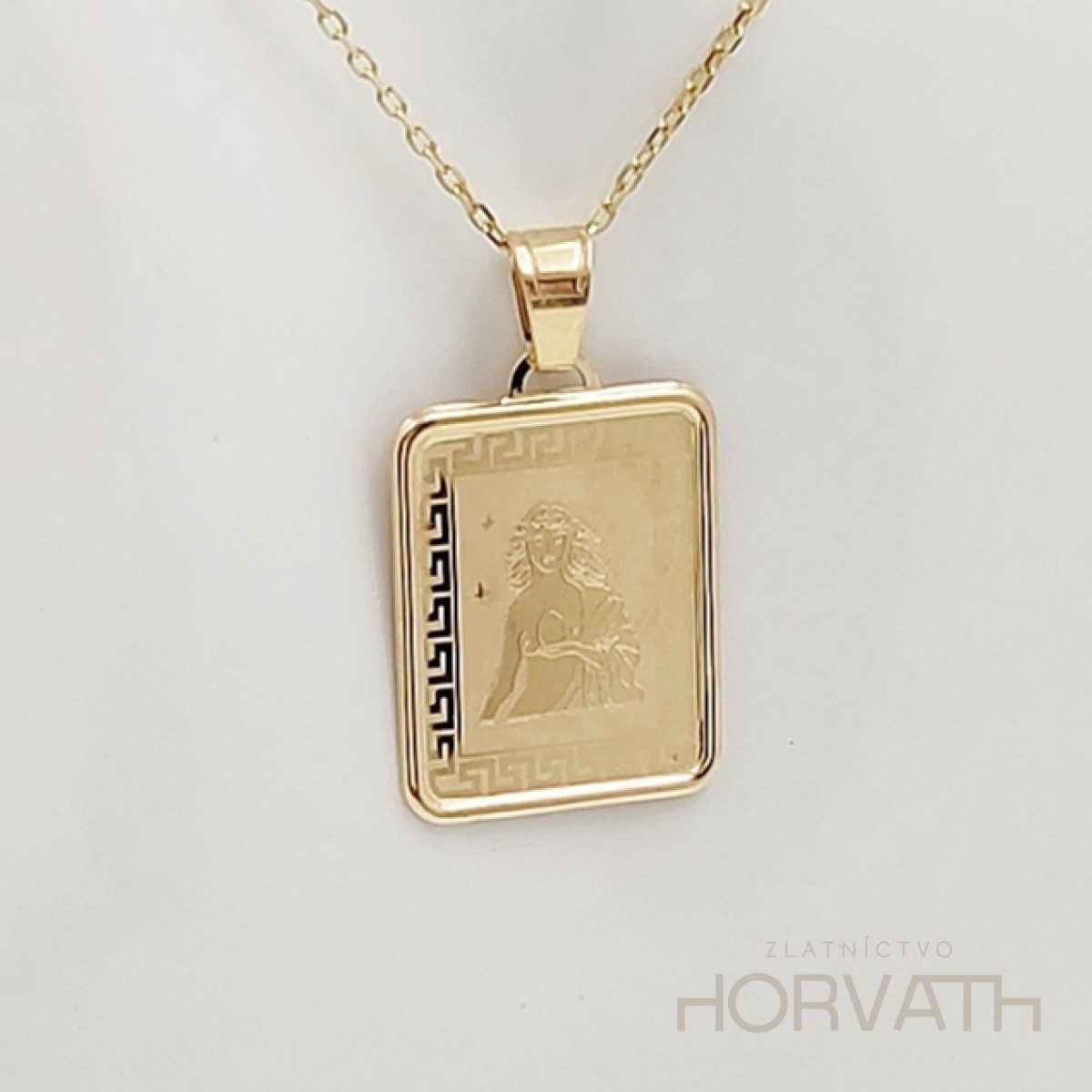 Zlatý prívesok panna. Prívesok je zo žltého zlata po bokoch zdobený gravírom, vyrobený zo 14 karátového zlata 585/1000.