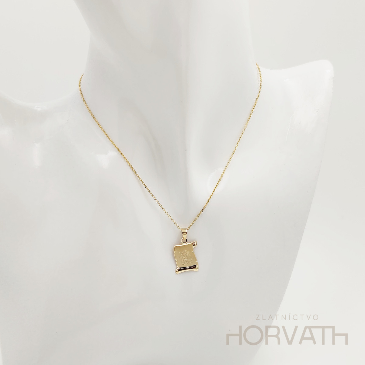 Zlatý prívesok panna. Prívesok je zo žltého zlata v tvare pergamenu, vyrobený zo 14 karátového zlata 585/1000.