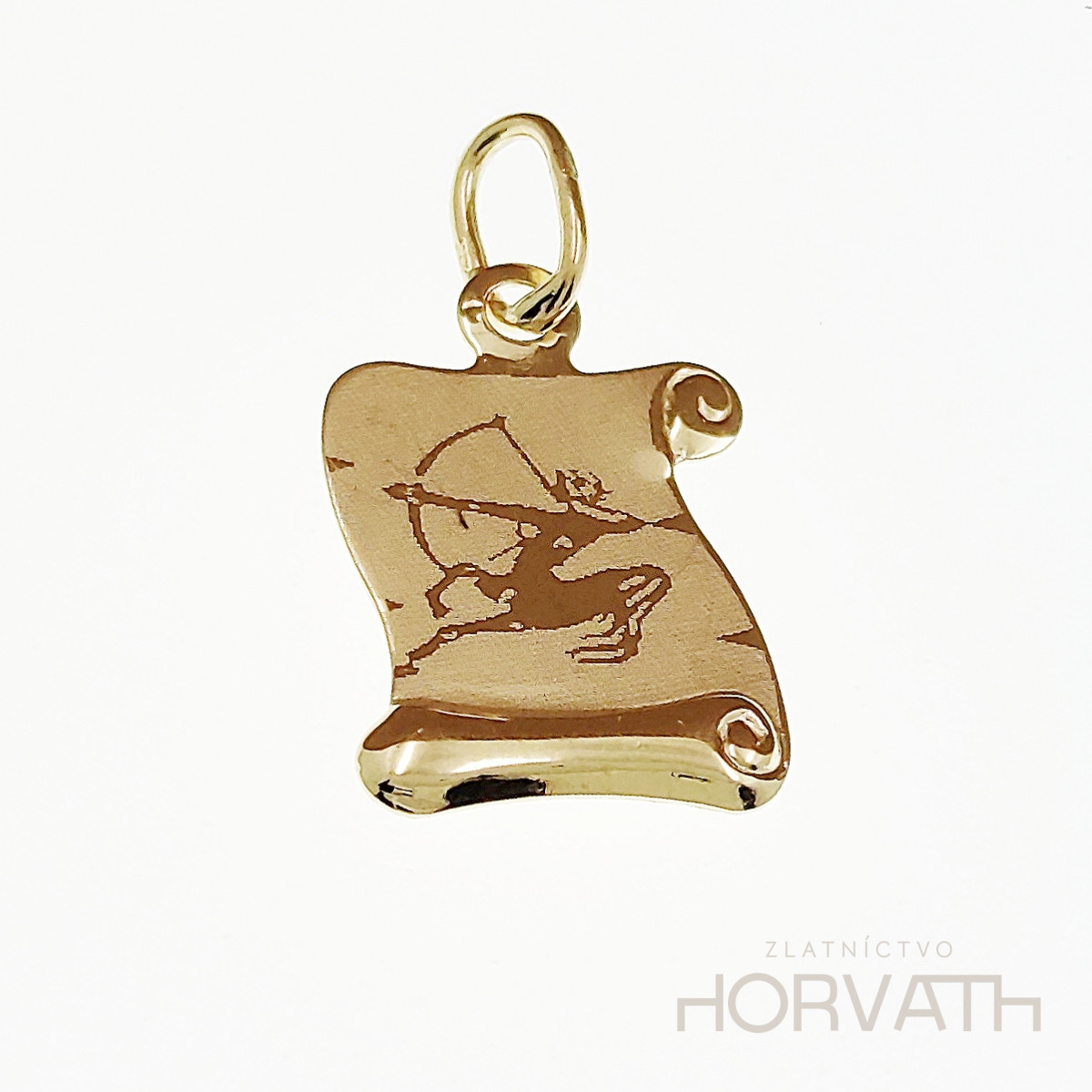Zlatý prívesok strelec. Prívesok je zo žltého zlata v tvare pergamenu, vyrobený zo 14 karátového zlata 585/1000.