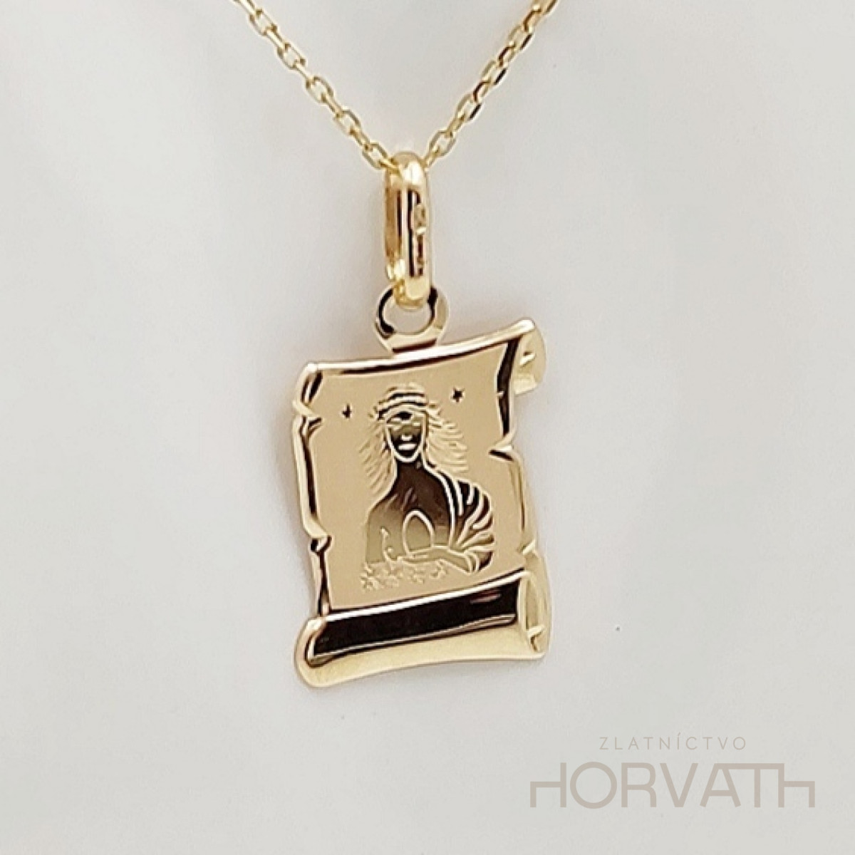 Zlatý prívesok panna. Prívesok je zo žltého zlata v tvare pergamenu, vyrobený zo 14 karátového zlata 585/1000.