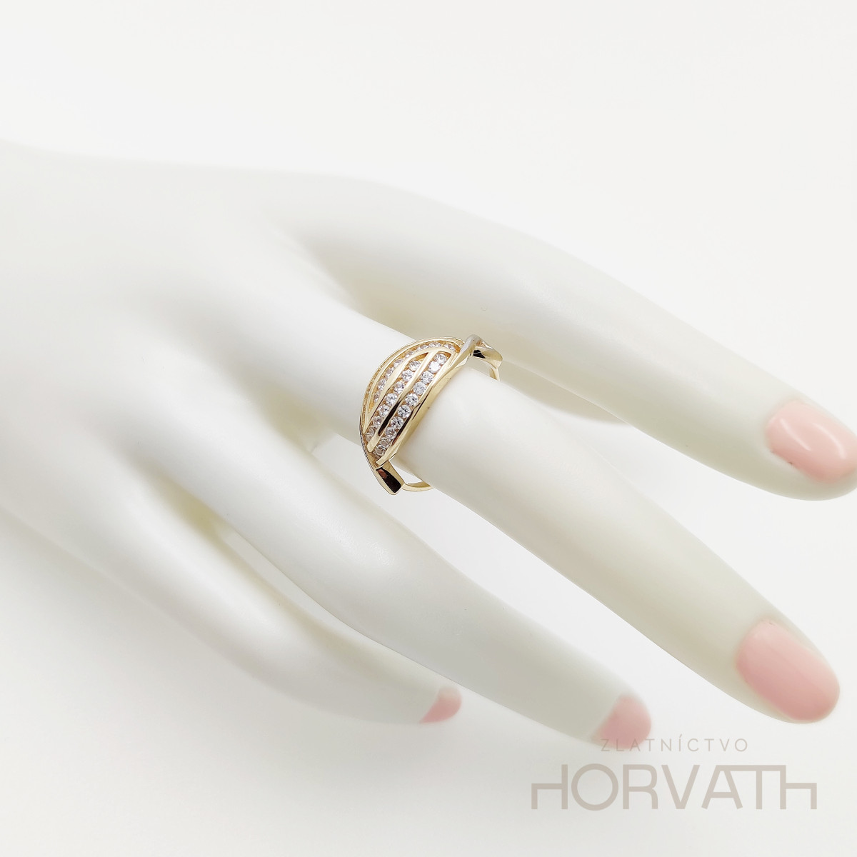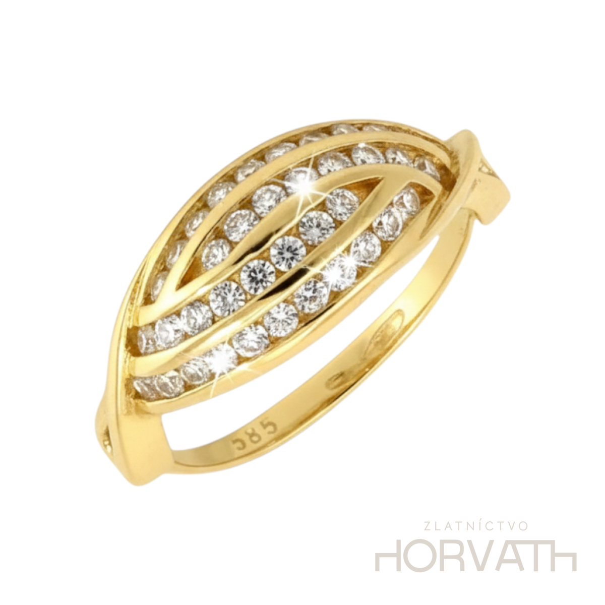 Zlatý dámsky prsteň je vyrobený zo žltého 14 karátového zlata. 585/1000.Prsteň zdobia jemné zirkóny