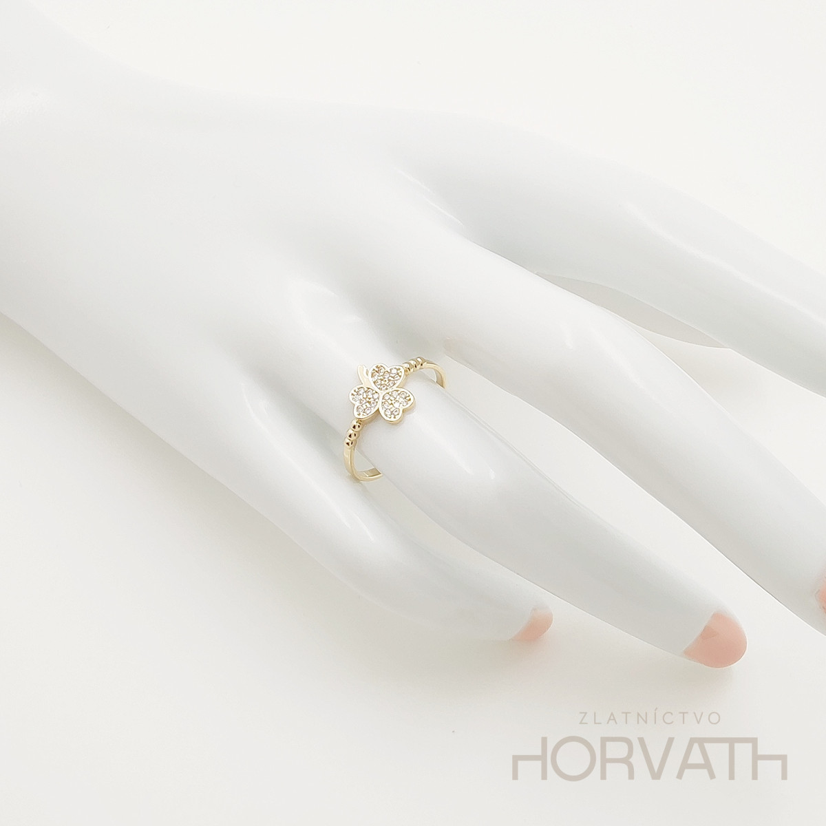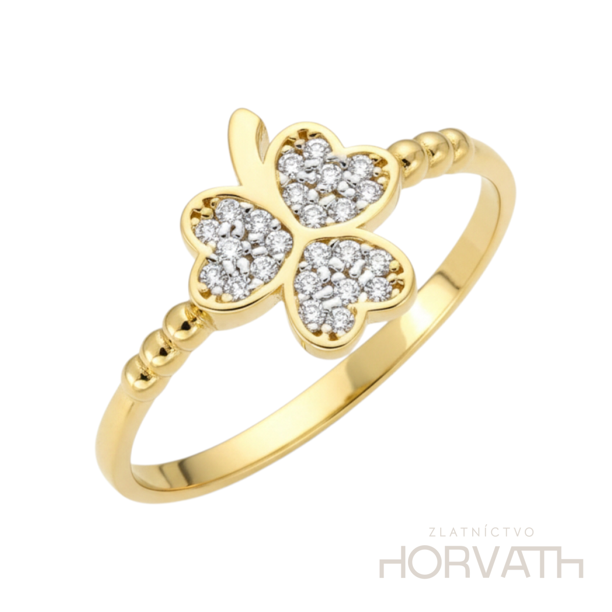Zlatý dámsky exkluzívny prsteň trojlístok je vyrobený zo 14 karátového zlata 585/1000