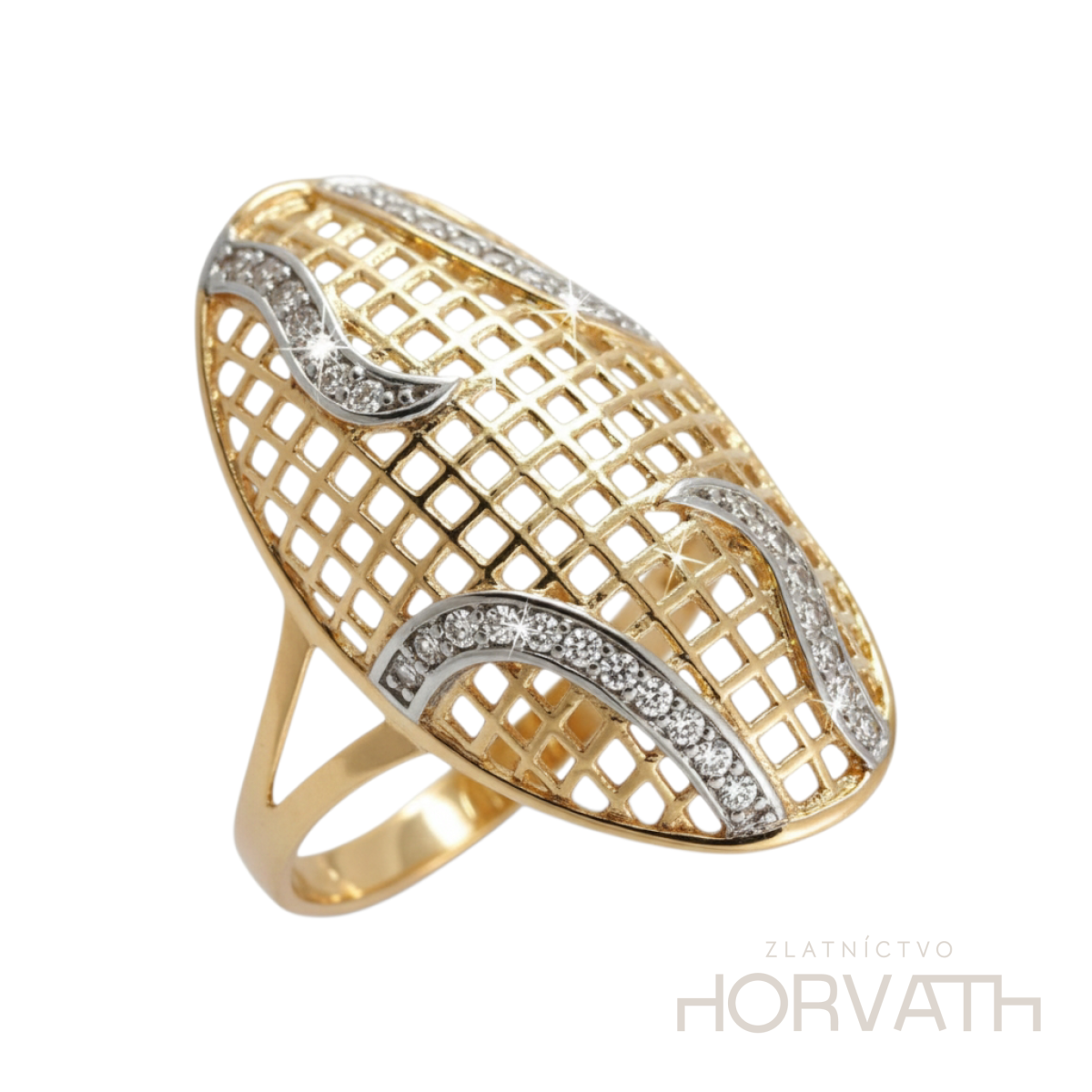 Zlatý dámsky extravagantný prsteň zdobený čírymi zirkónmi, vyrobený z 14 karátového zlata 585/1000.Priemer vrchnej plochy prsteňa je 2x2,5cm.