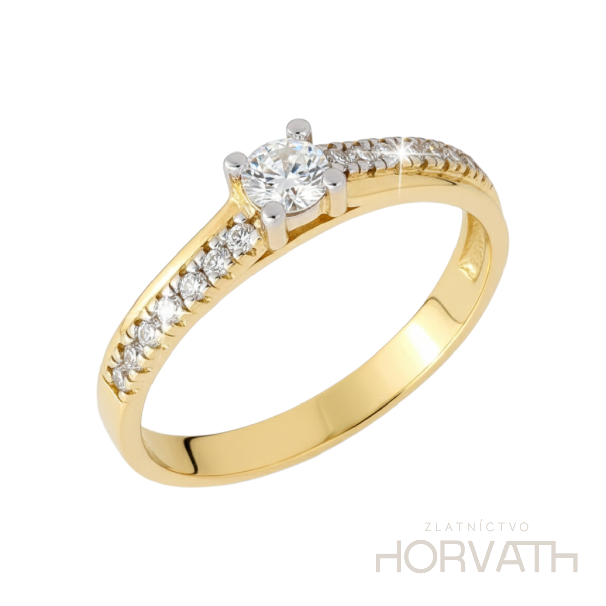 Zlatý dámsky prsteň zdobený zirkónom s priemerom 3mm,doplnený postrannými zirkónmi, vyrobený zo 14 karátového zlata 585/1000.