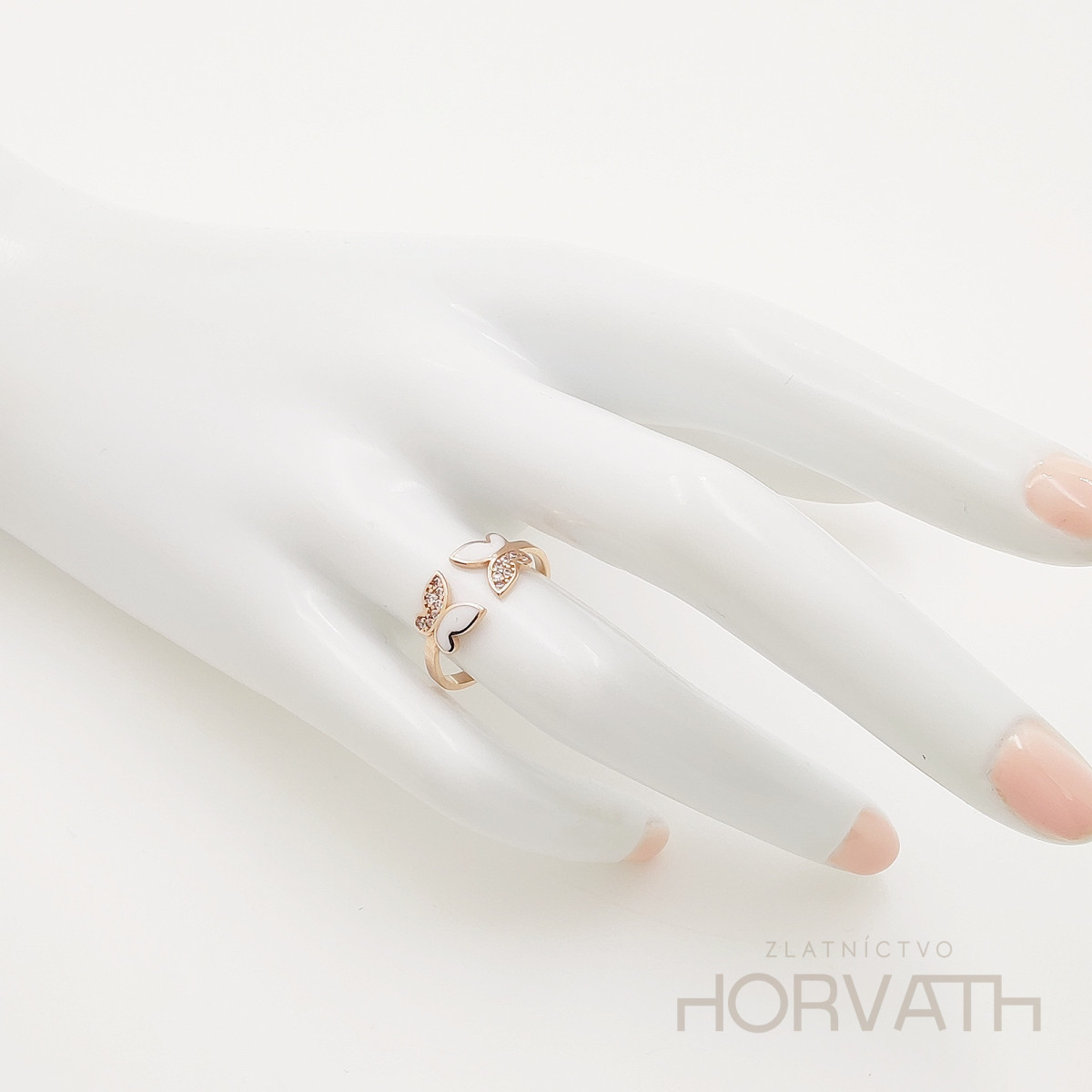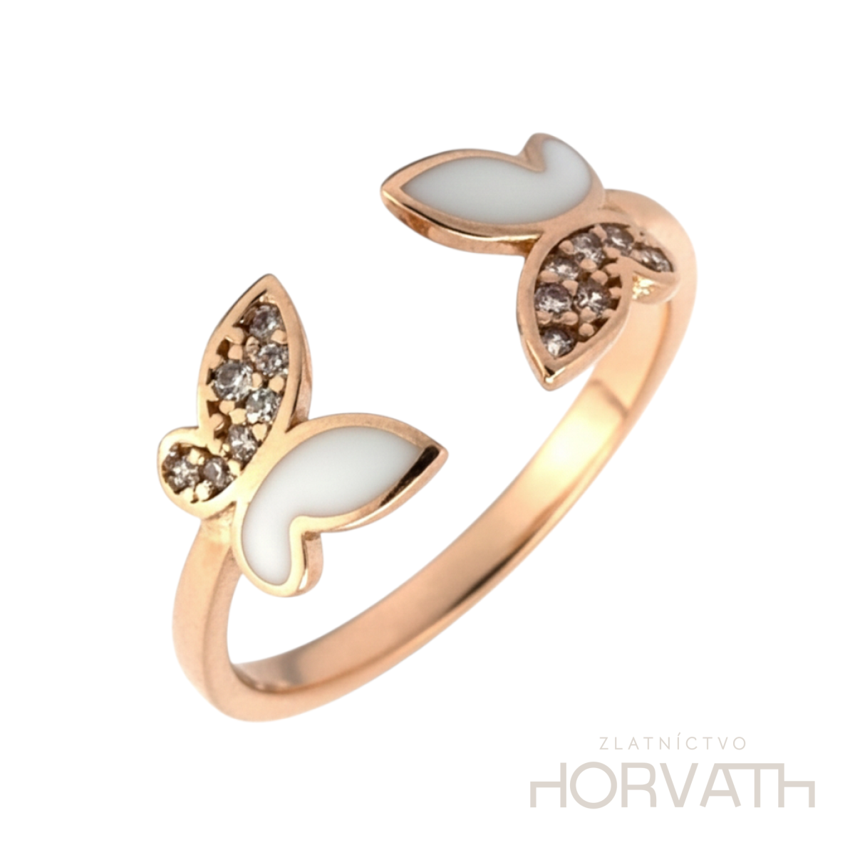 Jedinečný dámsky prsteň je vyrobený zo 14 karátového zlata 585/1000.Prsteň je zdobený zirkónmi a keramikou.