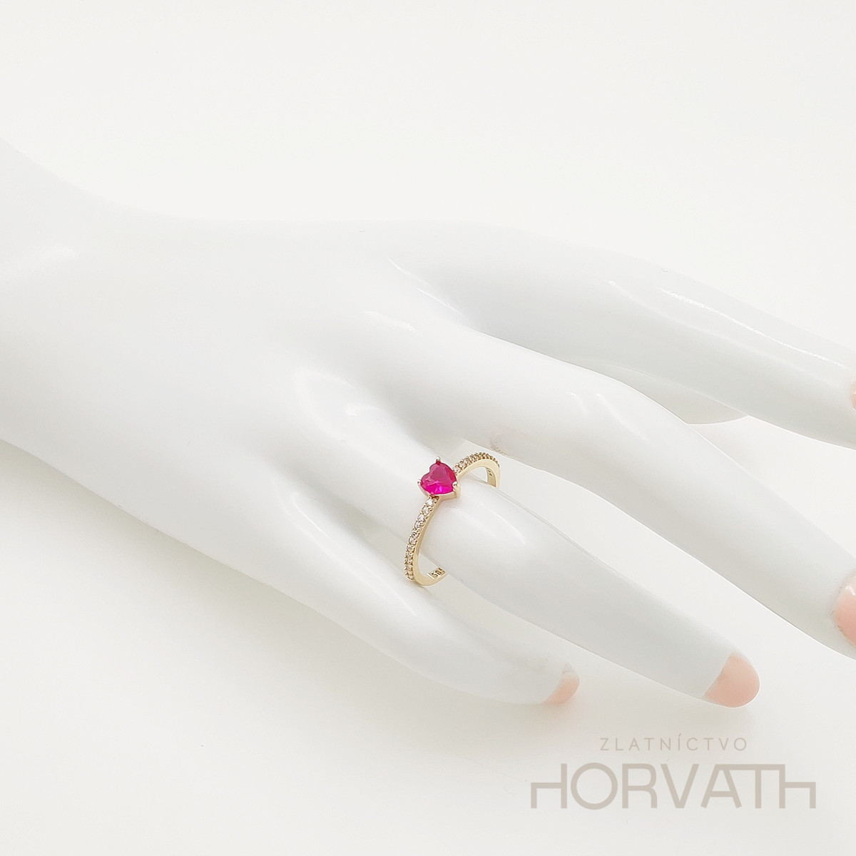 Jemný dámsky prsteň zdobený zirkónom do tvaru srdca je vyrobený zo 14 karátového zlata 585/1000.