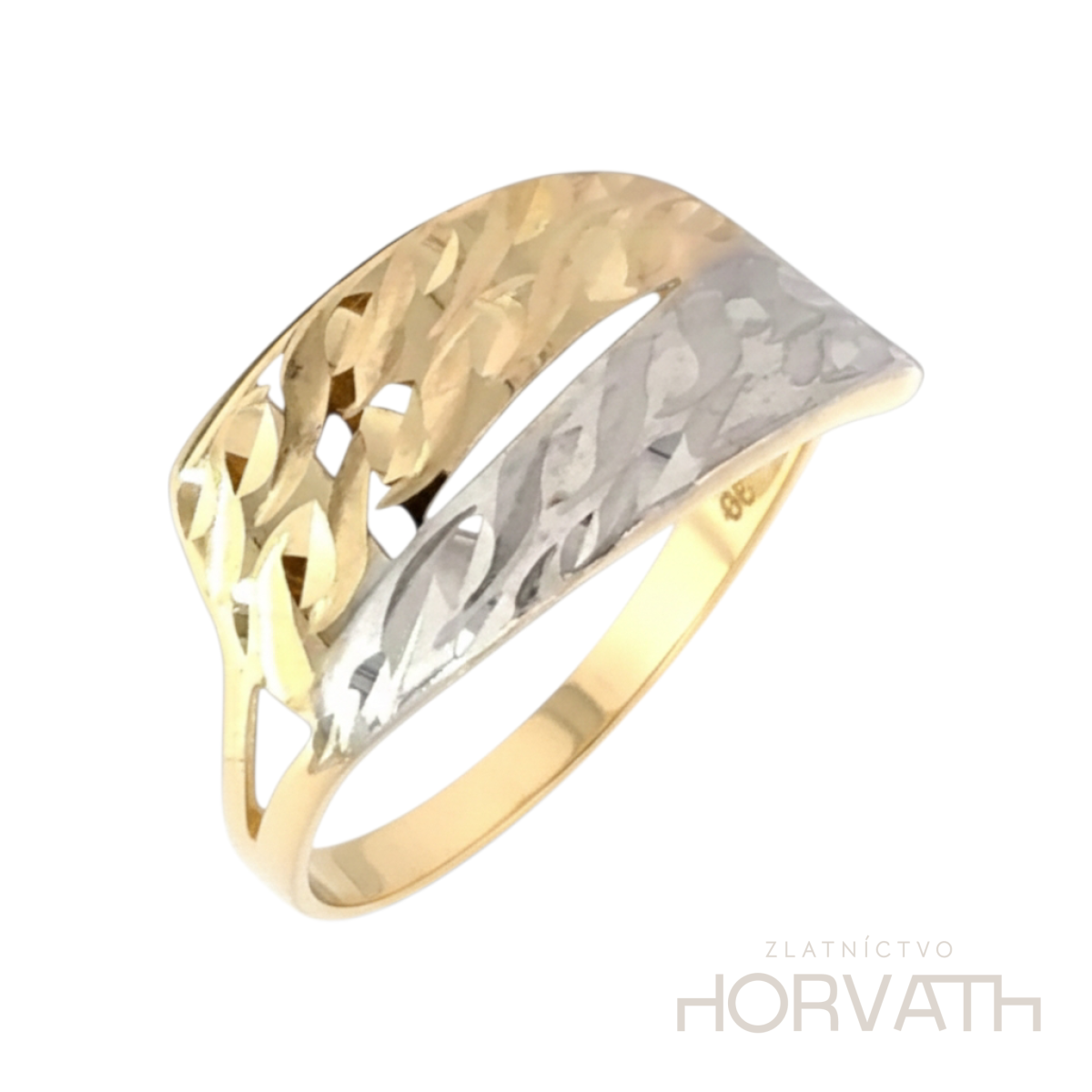 Jedinečný dámsky prsteň,zdobený gravírovaním je vyrobený zo 14 karátového zlata 585/1000