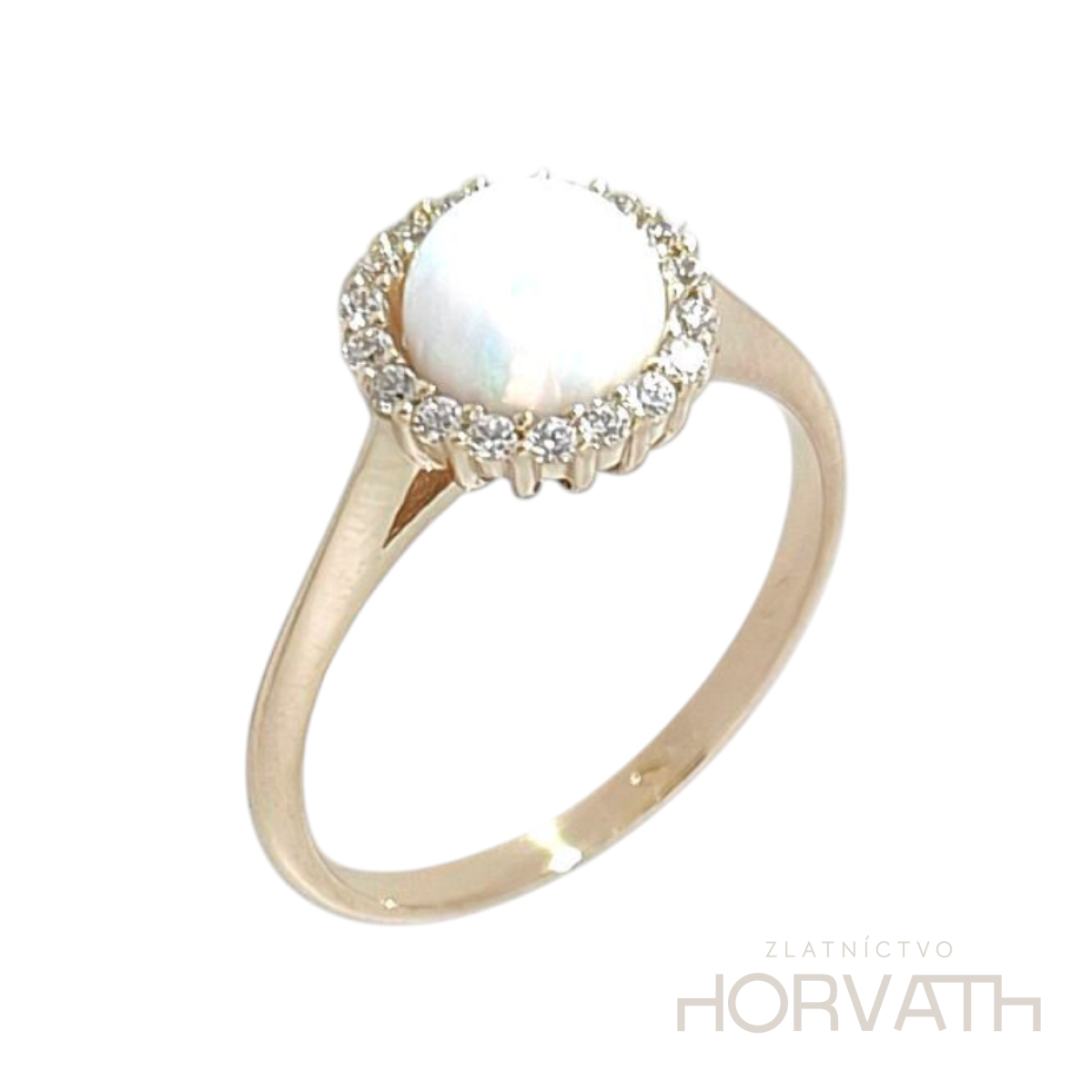 Dámsky prsteň zdobený opálom a zirkónmi, vyrobený zo 14 karátového zlata 585/1000.