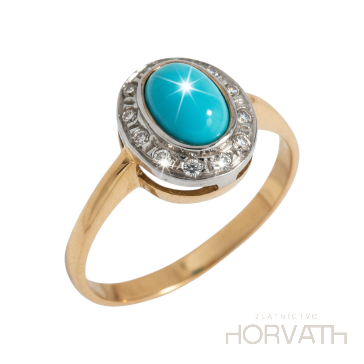 Dámsky zlatý prsteň zdobený tyrkysom a zirkónmi, vyrobený zo 14 karátového zlata 585/1000.