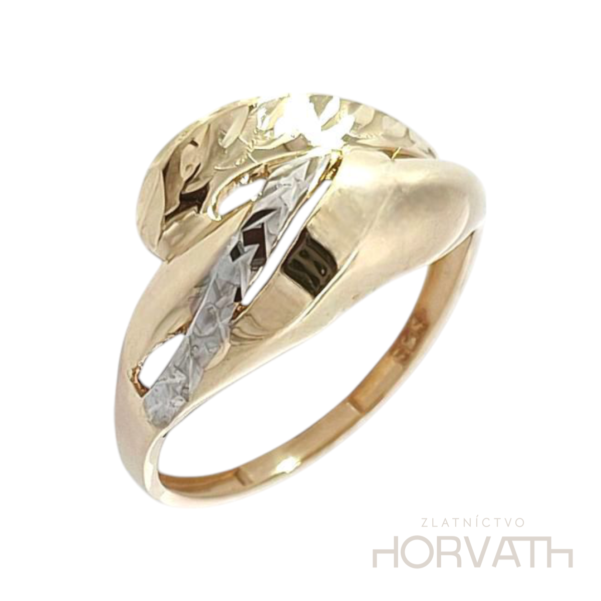 Jedinečný dámsky prsteň zdobený gravírovaním je vyrobený zo 14 karátového zlata 585/1000.