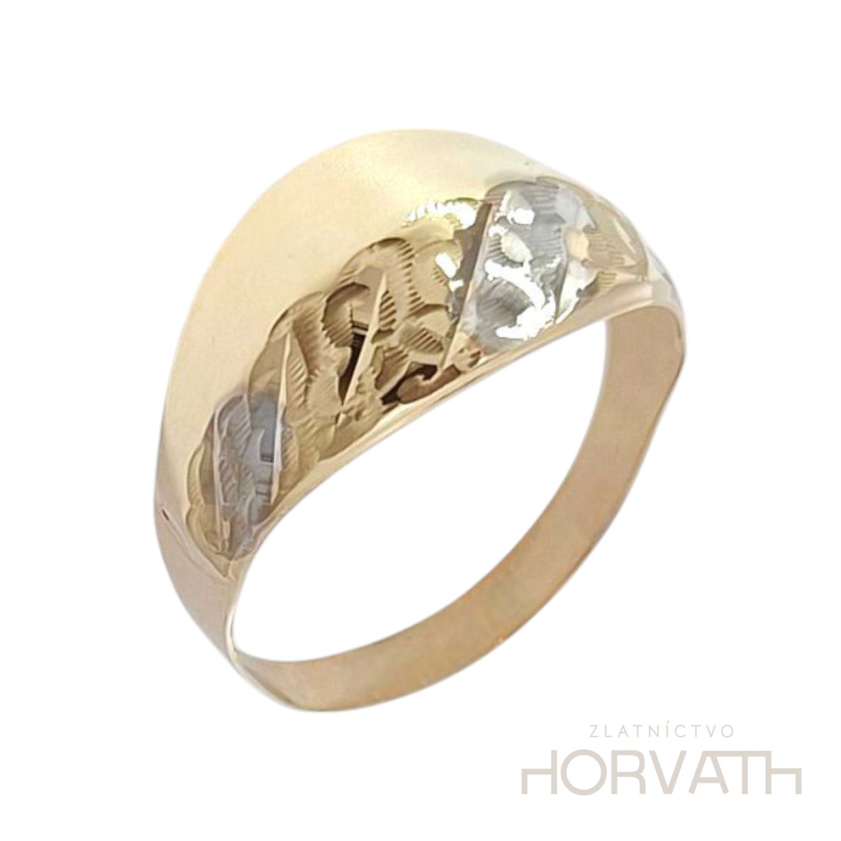 Zlatý prsteň 1,72 g. Šírka prsteňa 12 mm.